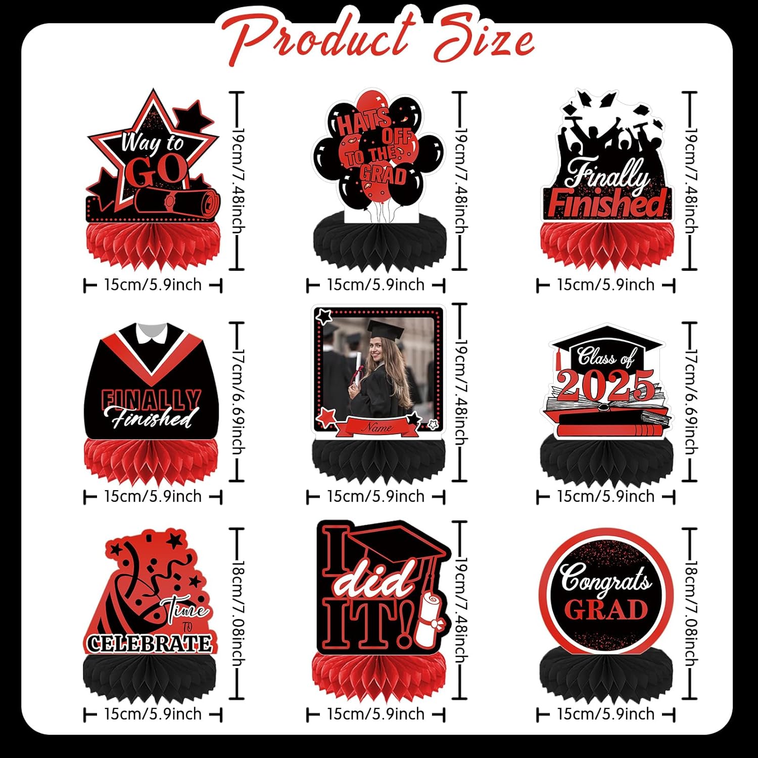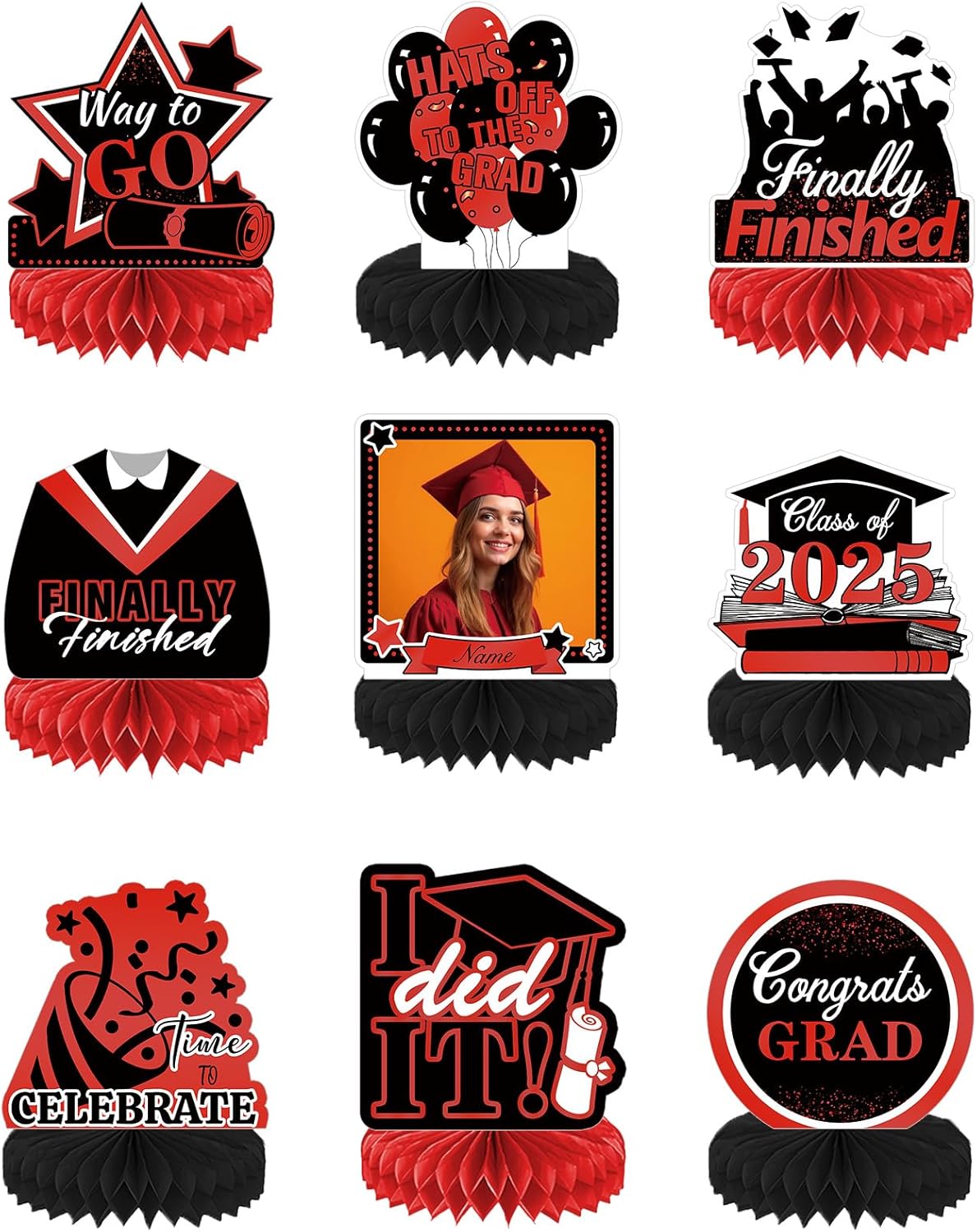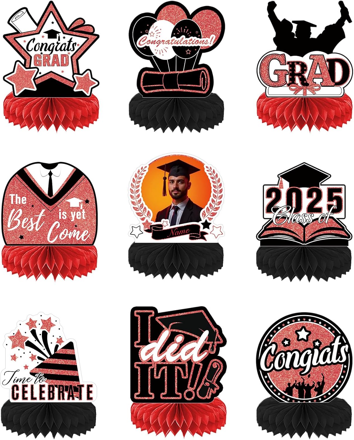 UUBAO 9 PCS Custom Graduation Party Honeycomb Centerpieces Class of 2025 Congrats Grad Decorations Congratulate Graduation Table Toppers for Graduation Party Favor Supplies (Red)
