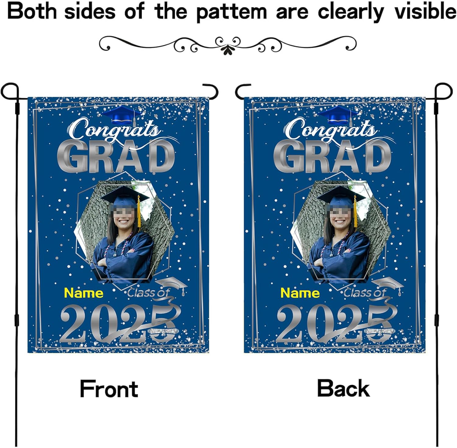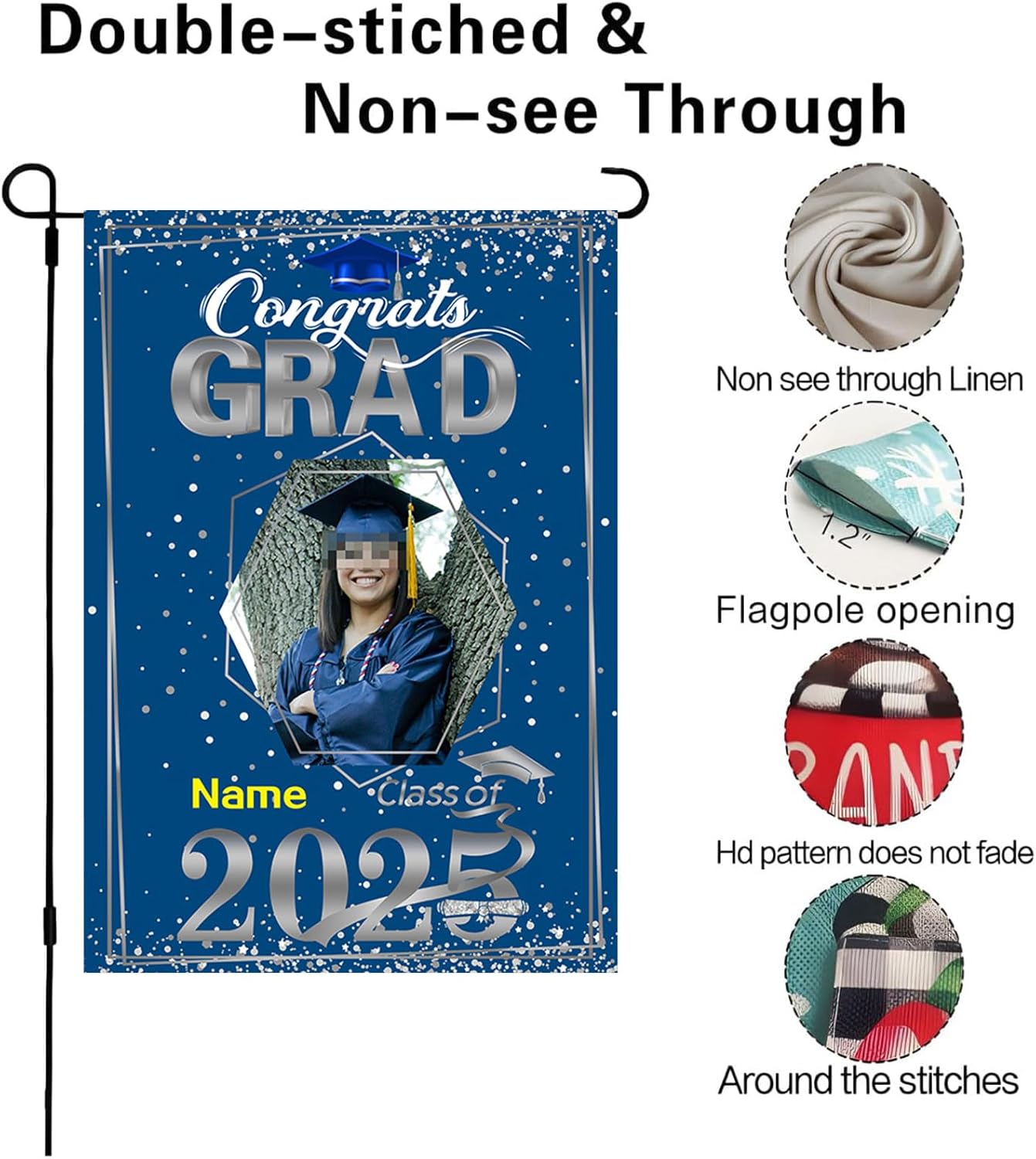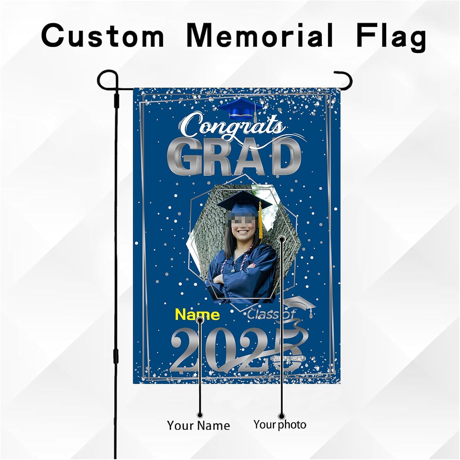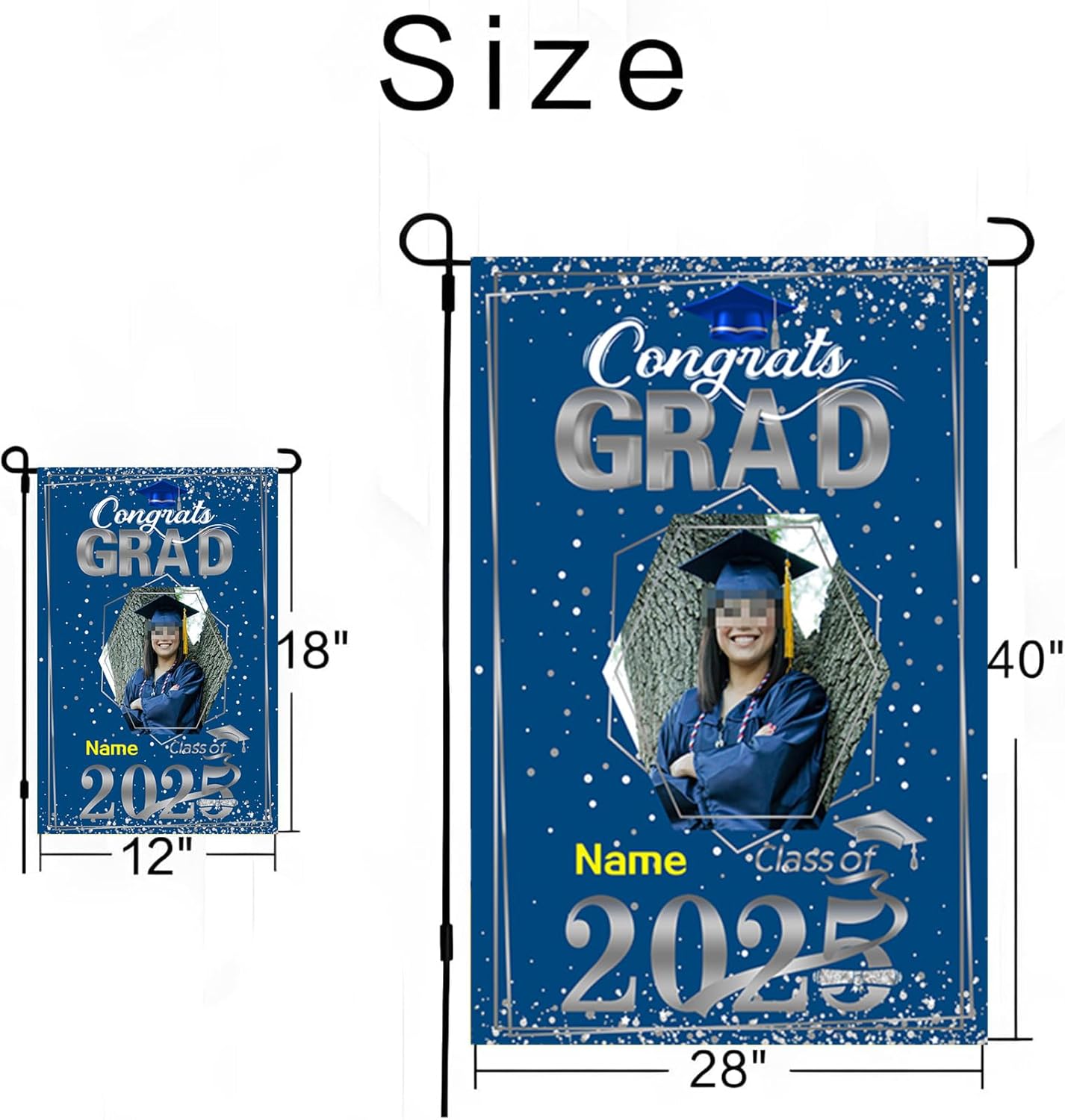 - 【Customize】Celebrate your graduation with our Custom 2025 graduation flag,featuring customizable size, photo and name for a truly personal touch.Just click "customize now" button on top right. 【Material】Double-sided burlap flag is a weather-resistant, cold-resistant durable material,12*18 inches or 28*40 inches for choose.UV-resistant printing with bright patterns ensures will never fade and lasts as a cherished memory forever for outdoor use. 【Easy assembly and use】Custom artistic garden flag features a sleeve at top for use with any standard flag pole or stand,flag pole NOT included. 【Wide Application】Lightweight and portable, making them easy to transport and adapt to different locations,they provide a versatile marketing tool that can be displayed anywhere you desire.Perfect choice for graduation party supplies or a sweet gift for your family and friends. 【Service】100% Guarantee Risk-Free Purchase.In any case you are unsatisfied with the purchase of our product, just feel free to reach us.
