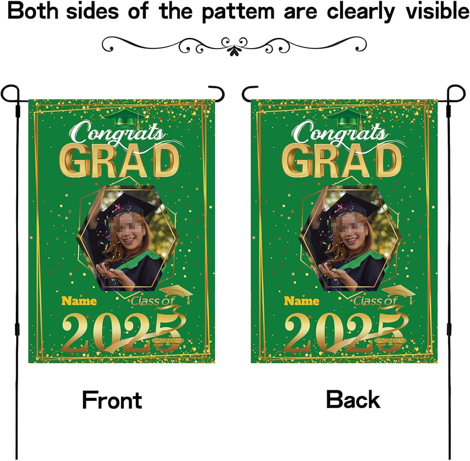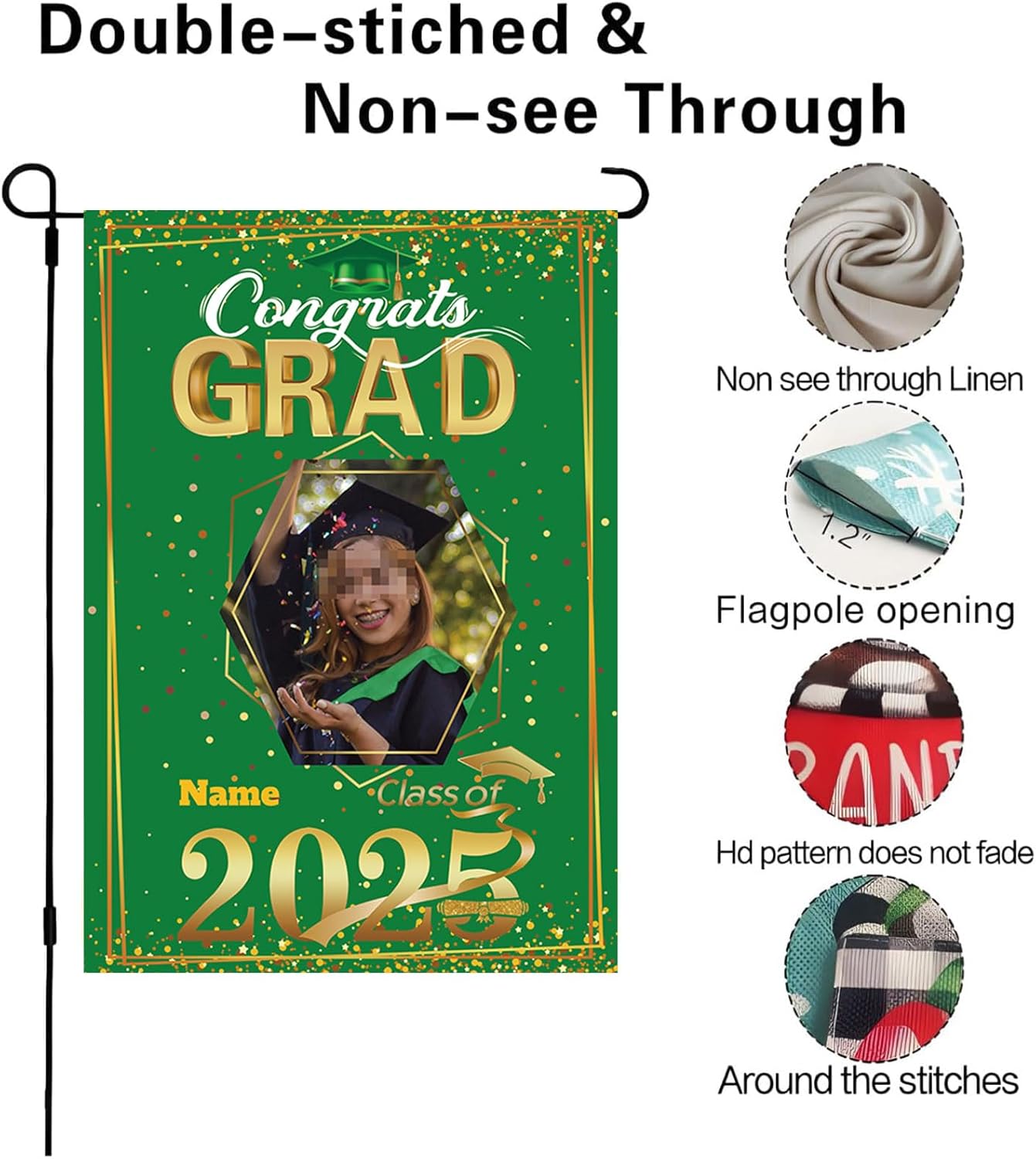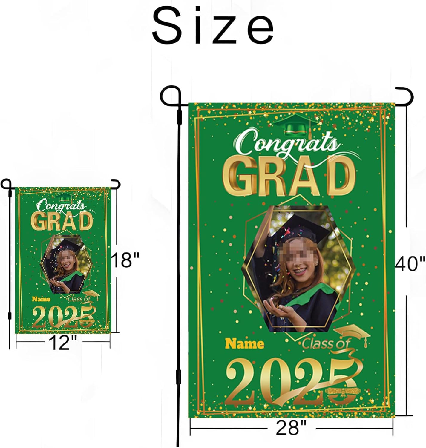 - 【Customize】Celebrate your graduation with our Custom 2025 graduation flag,featuring customizable size, photo and name for a truly personal touch.Just click "customize now" button on top right. 【Material】Double-sided burlap flag is a weather-resistant, cold-resistant durable material,12*18 inches or 28*40 inches for choose.UV-resistant printing with bright patterns ensures will never fade and lasts as a cherished memory forever for outdoor use. 【Easy assembly and use】Custom artistic garden flag features a sleeve at top for use with any standard flag pole or stand,flag pole NOT included. 【Wide Application】Lightweight and portable, making them easy to transport and adapt to different locations,they provide a versatile marketing tool that can be displayed anywhere you desire.Perfect choice for graduation party supplies or a sweet gift for your family and friends. 【Service】100% Guarantee Risk-Free Purchase.In any case you are unsatisfied with the purchase of our product, just feel free to reach us.