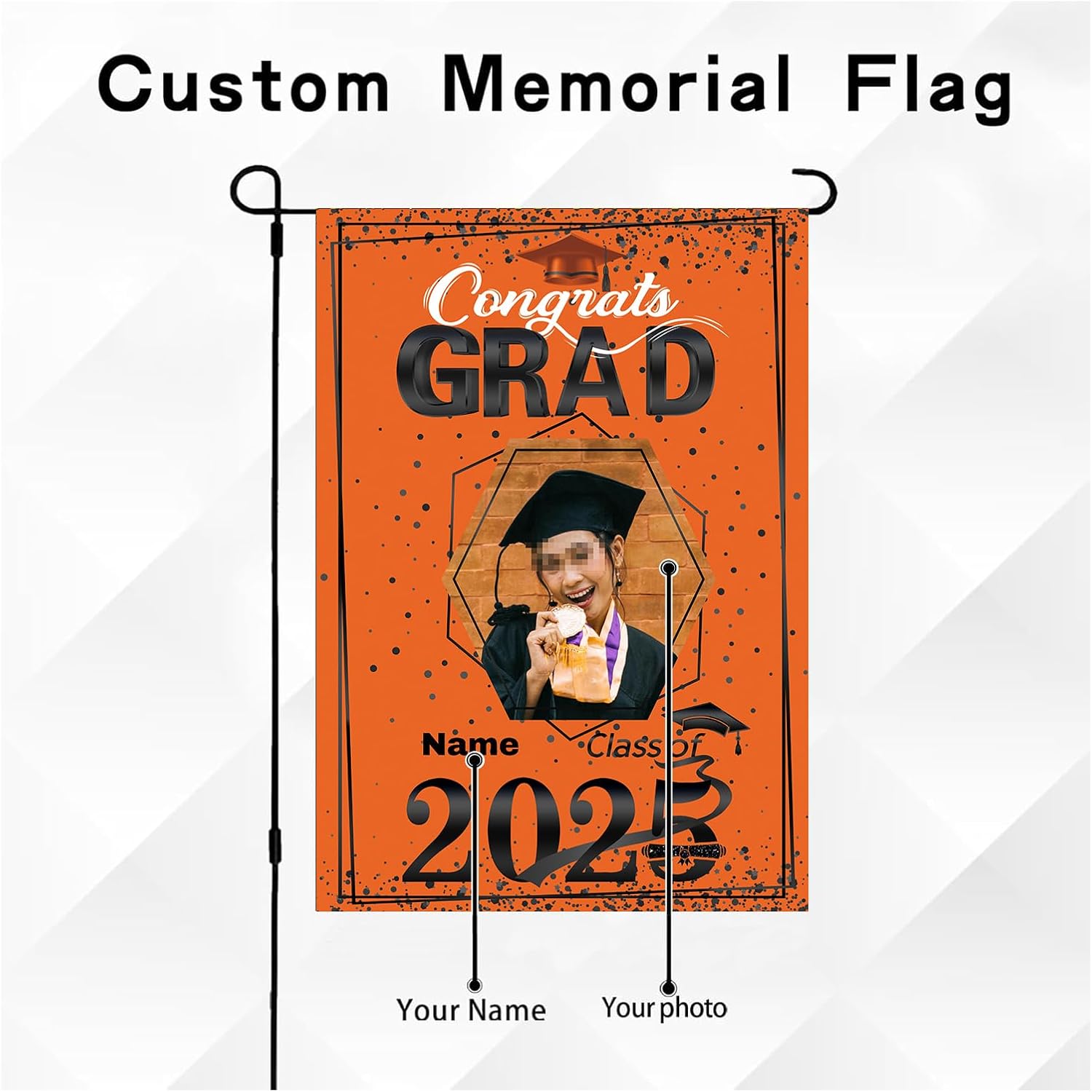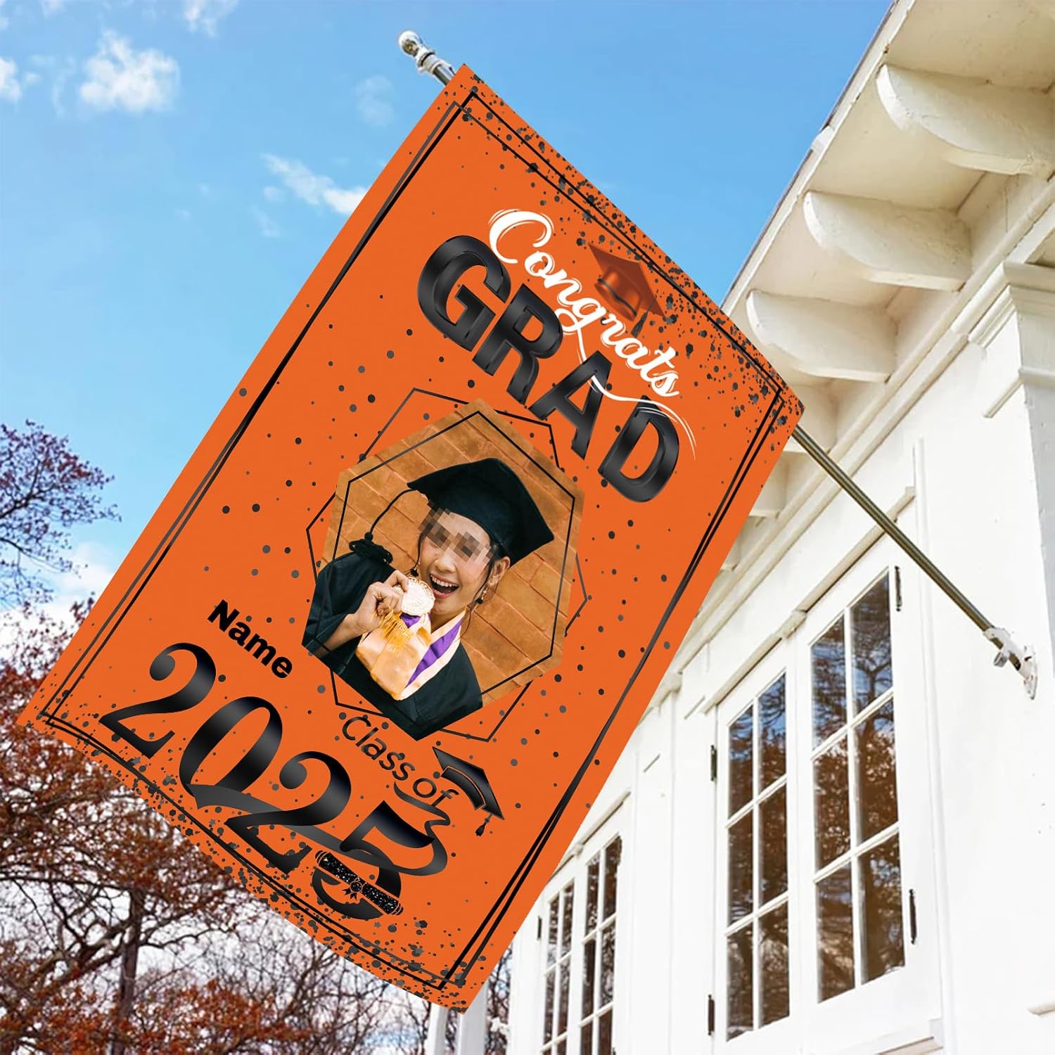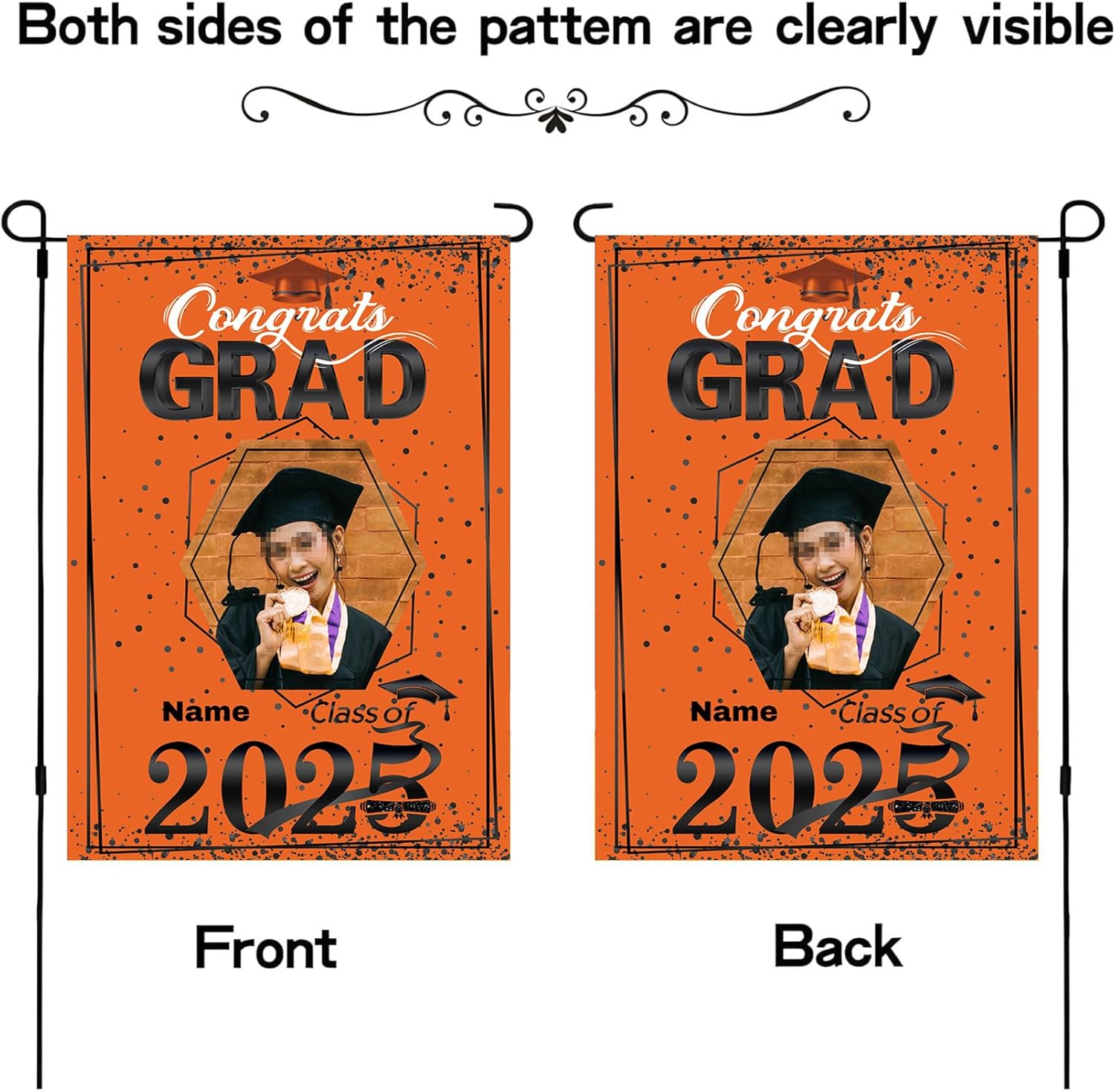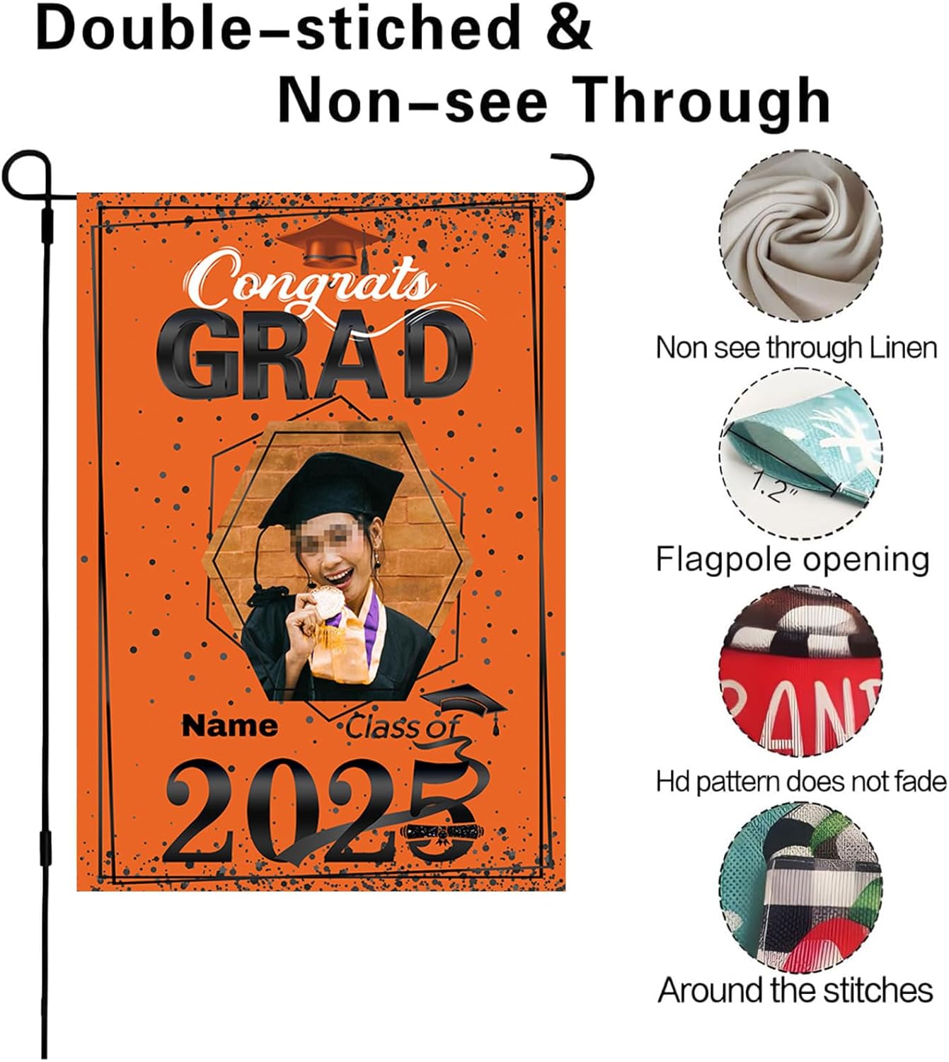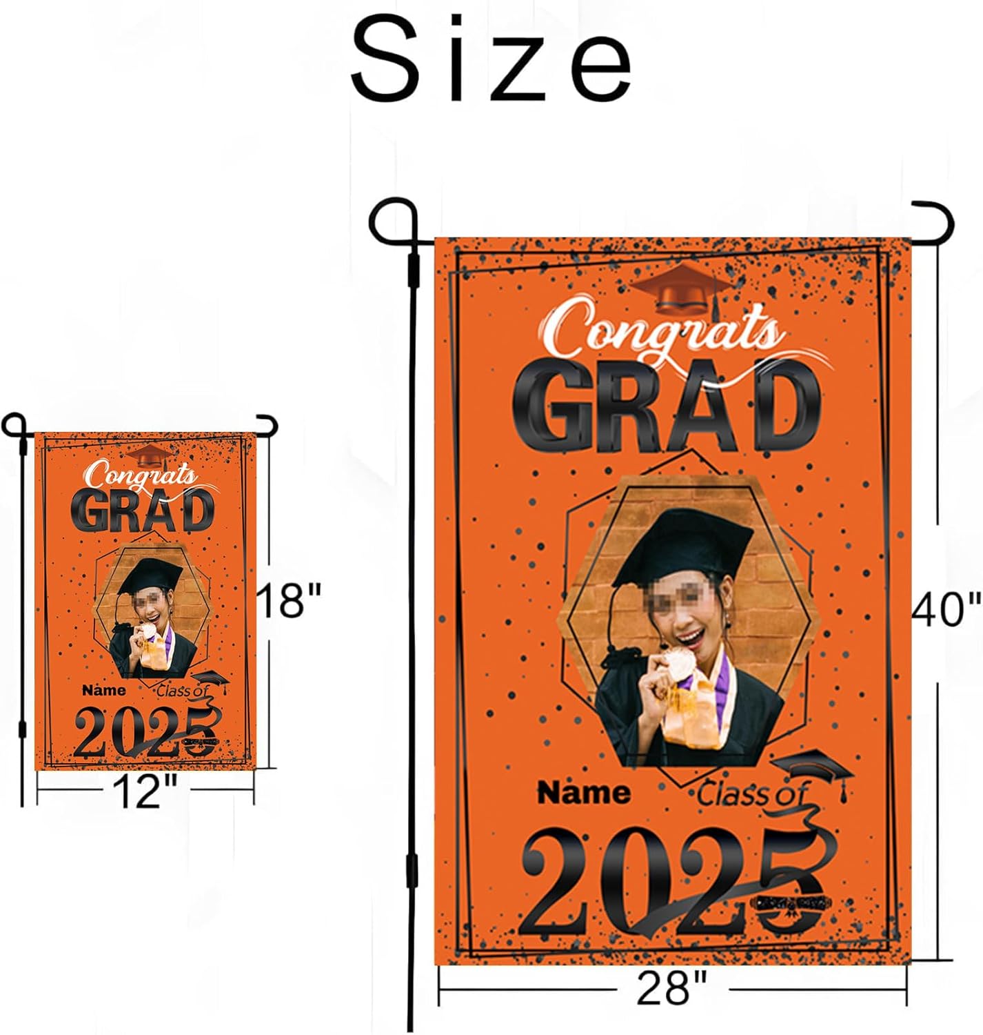 - 【Customize】Celebrate your graduation with our Custom 2025 graduation flag,featuring customizable size, photo and name for a truly personal touch.Just click "customize now" button on top right. 【Material】Double-sided burlap flag is a weather-resistant, cold-resistant durable material,12*18 inches or 28*40 inches for choose.UV-resistant printing with bright patterns ensures will never fade and lasts as a cherished memory forever for outdoor use. 【Easy assembly and use】Custom artistic garden flag features a sleeve at top for use with any standard flag pole or stand,flag pole NOT included. 【Wide Application】Lightweight and portable, making them easy to transport and adapt to different locations,they provide a versatile marketing tool that can be displayed anywhere you desire.Perfect choice for graduation party supplies or a sweet gift for your family and friends. 【Service】100% Guarantee Risk-Free Purchase.In any case you are unsatisfied with the purchase of our product, just feel free to reach us.