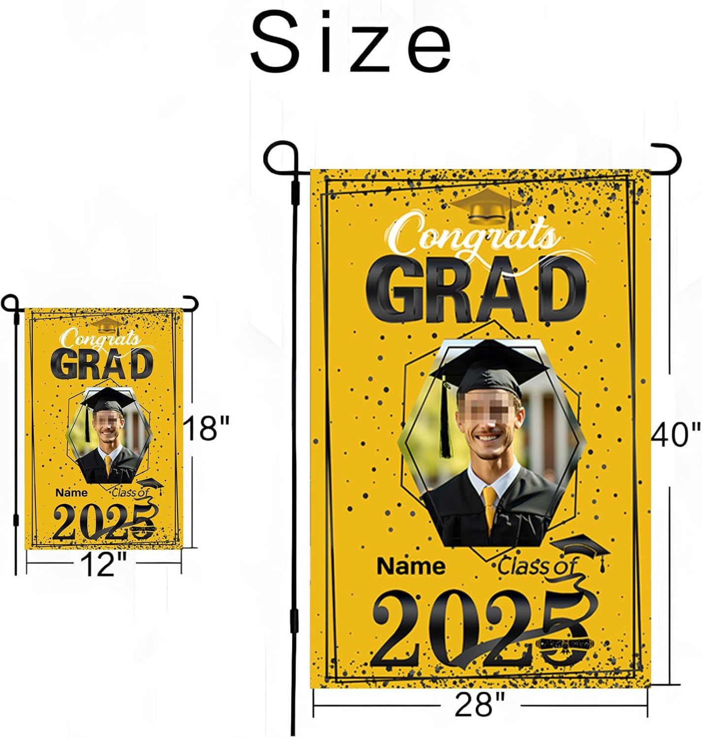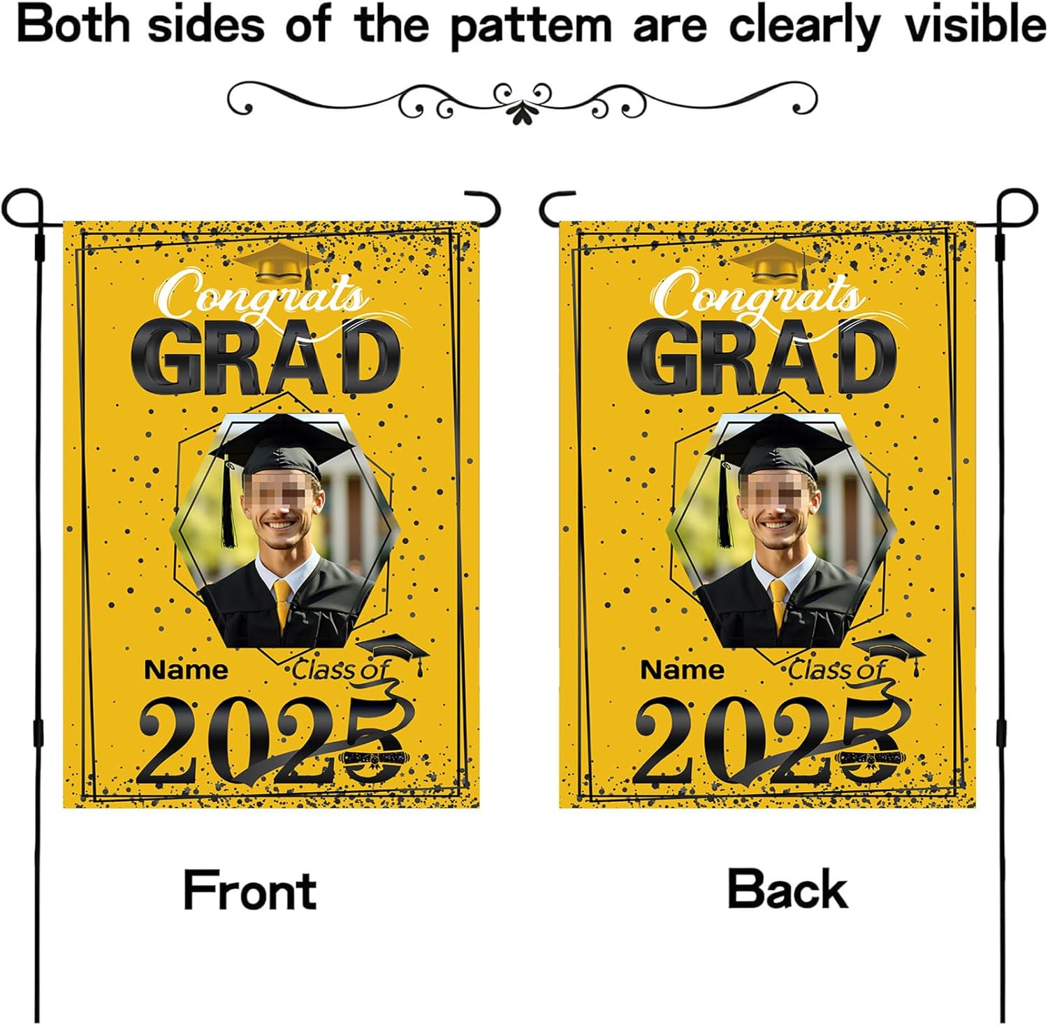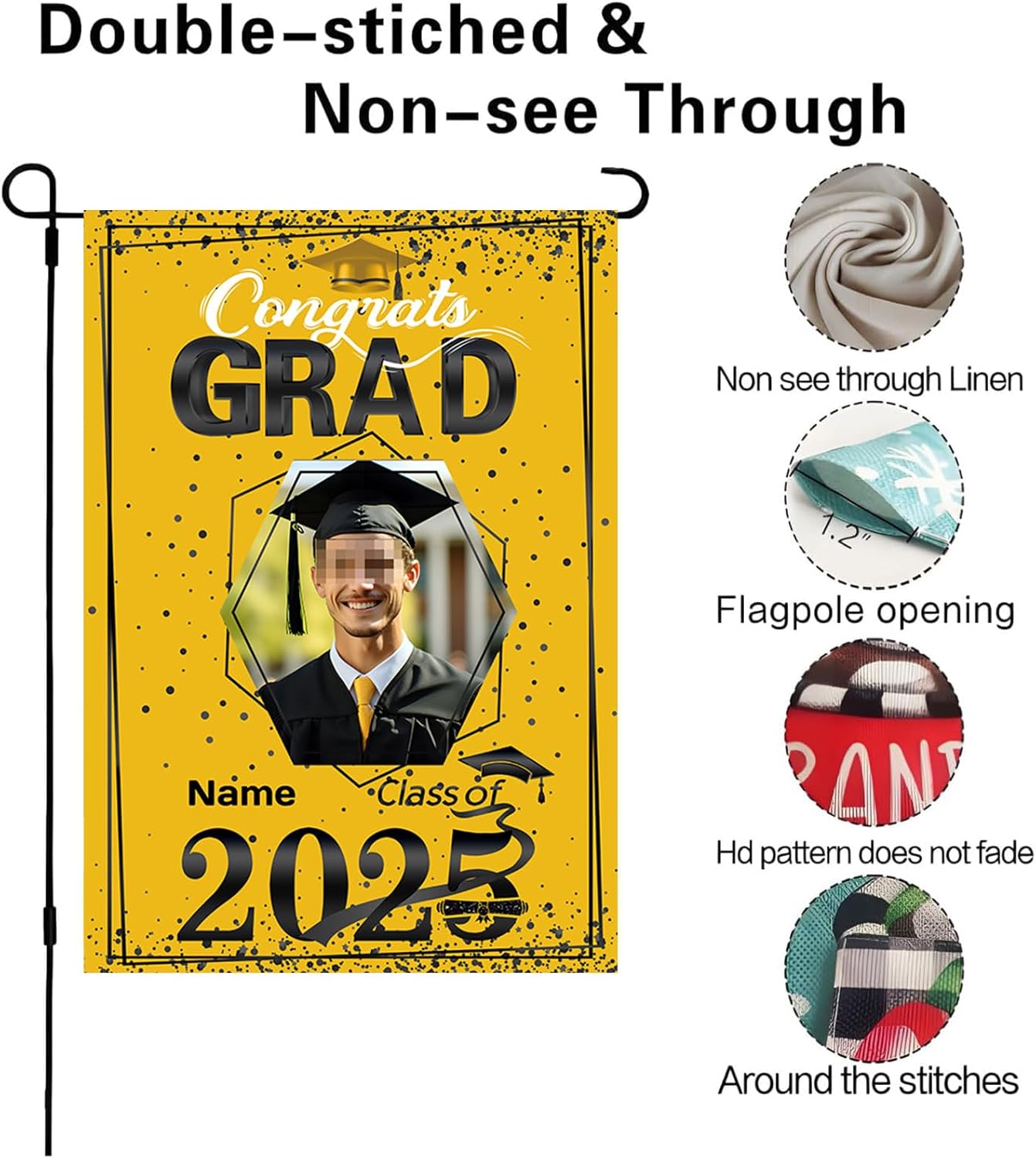 • 【Customize】Celebrate your graduation with our Custom 2025 graduation flag,featuring customizable size, photo and name for a truly personal touch.Just click "customize now" button on top right. 【Material】Double-sided burlap flag is a weather-resistant, cold-resistant durable material,12*18 inches or 28*40 inches for choose.UV-resistant printing with bright patterns ensures will never fade and lasts as a cherished memory forever for outdoor use. 【Easy assembly and use】Custom artistic garden flag features a sleeve at top for use with any standard flag pole or stand,flag pole NOT included. 【Wide Application】Lightweight and portable, making them easy to transport and adapt to different locations,they provide a versatile marketing tool that can be displayed anywhere you desire.Perfect choice for graduation party supplies or a sweet gift for your family and friends. 【Service】100% Guarantee Risk-Free Purchase.In any case you are unsatisfied with the purchase of our product, just feel free to reach us.