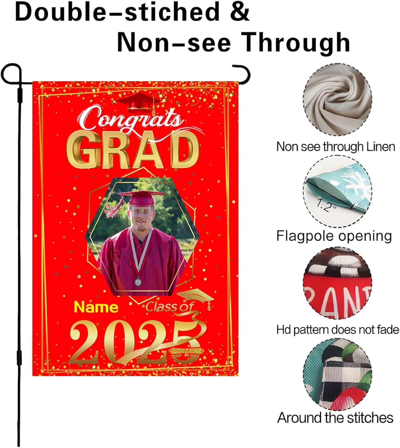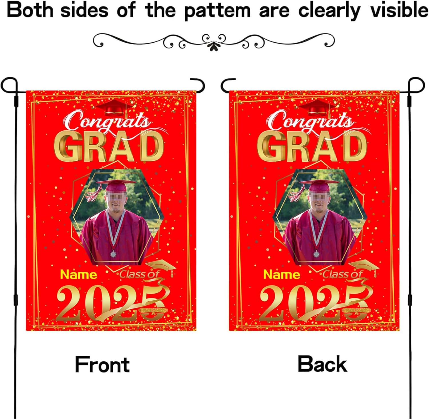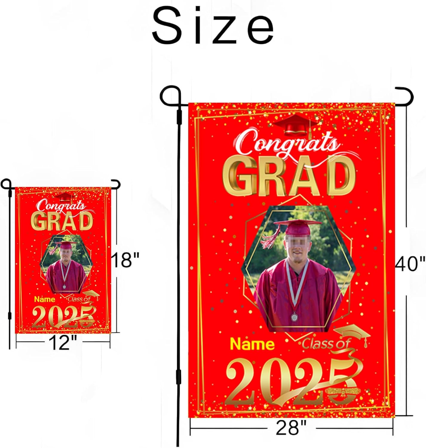 - 【Customize】Celebrate your graduation with our Custom 2025 graduation flag,featuring customizable size, photo and name for a truly personal touch.Just click "customize now" button on top right. 【Material】Double-sided burlap flag is a weather-resistant, cold-resistant durable material,12*18 inches or 28*40 inches for choose.UV-resistant printing with bright patterns ensures will never fade and lasts as a cherished memory forever for outdoor use. 【Easy assembly and use】Custom artistic garden flag features a sleeve at top for use with any standard flag pole or stand,flag pole NOT included. 【Wide Application】Lightweight and portable, making them easy to transport and adapt to different locations,they provide a versatile marketing tool that can be displayed anywhere you desire.Perfect choice for graduation party supplies or a sweet gift for your family and friends. 【Service】100% Guarantee Risk-Free Purchase.In any case you are unsatisfied with the purchase of our product, just feel free to reach us.