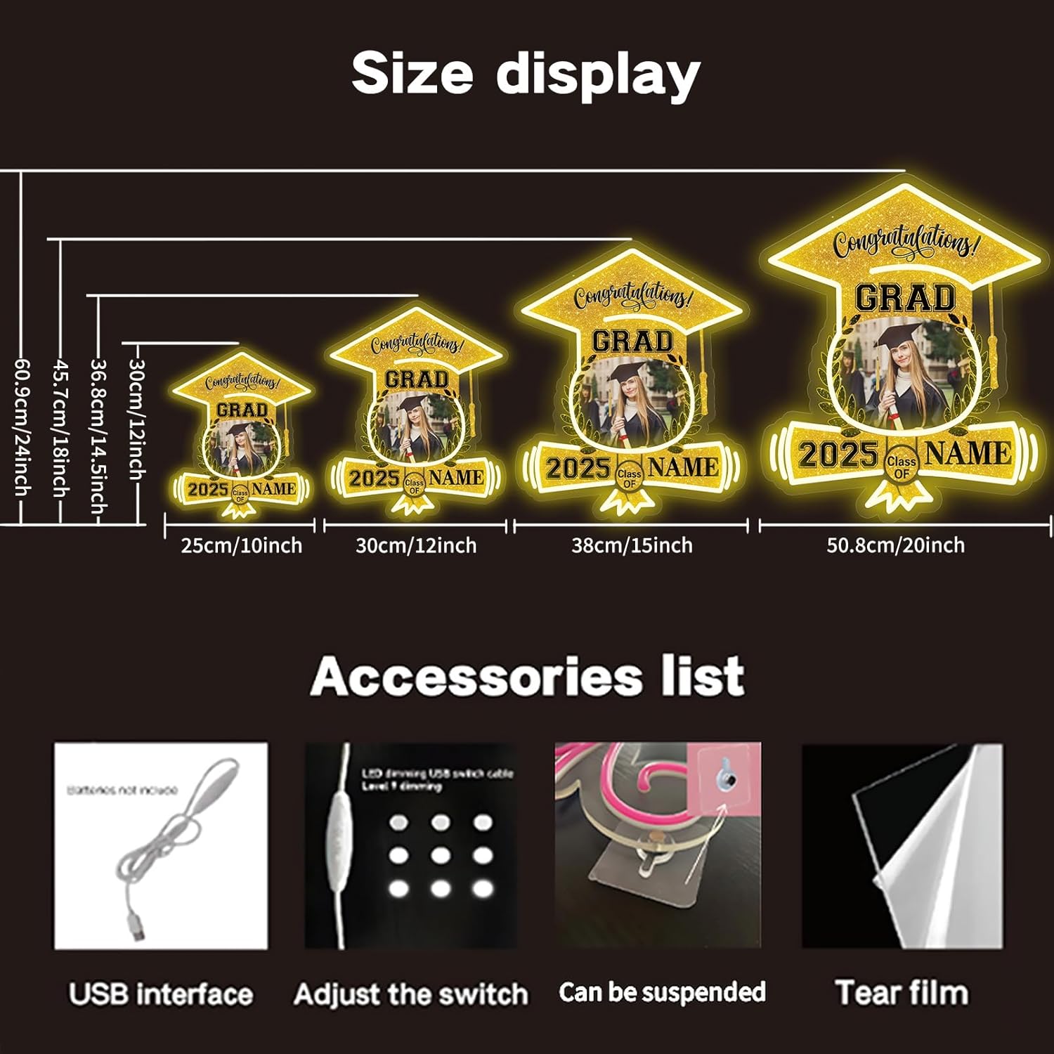 - 【Customize】Celebrate your graduation with our Custom 2025 Graduation neon sign,the unique style brighten up your space.featuring customizable size, photo and name for a truly personal touch.Just click "customize now" on top right.
