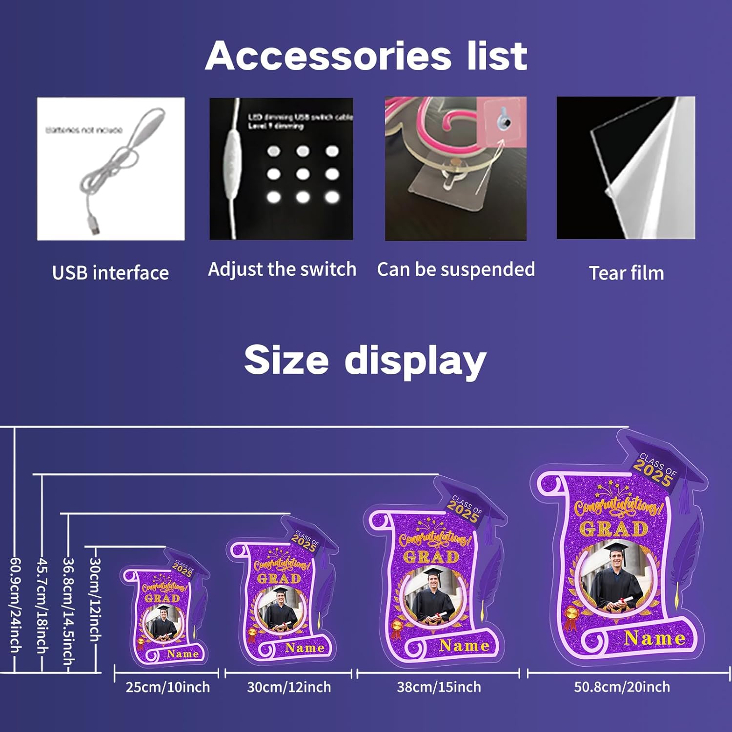 - 【Customize】Celebrate your graduation with our Custom 2025 Graduation neon sign,the unique style brighten up your space.featuring customizable size, photo and name for a truly personal touch.Just click "customize now" on top right. 【Material】Our LED neon sign is made of premium acrylic and silicone strip, safer and more bright but not dazzling.Professionally printed with bright patterns will never fade and lasts as a cherished memory for years to come.Energy-efficient LED lights make our neon signs both eco-friendly and cost-effective. 【Easy assembly and use】Comes with two different mounting accessories(metal chain,adhesive hooks) for easy hanging/mounting on a wall or other surface.Powered by USB,you can use any plug with USB port (no power adapter),The dimmer is on the usb cord, which is easy to adjust the brightness. 【Wide Application】Four sizes available: 10x12in/12x14.5in/15x18in/20x24in.The strong, clear pattern and crystal texture is very eye-catching in the sunlight. Ideal for display on a fireplace mantel, desk, closet, or locker, adding a touch of elegance to any space.Perfect choice for graduation gift and keepsake. 【 Service】We provide sincere service and products. Any problem or other special customization requirements, please contact us from message,we will give you solution within 24 hours.