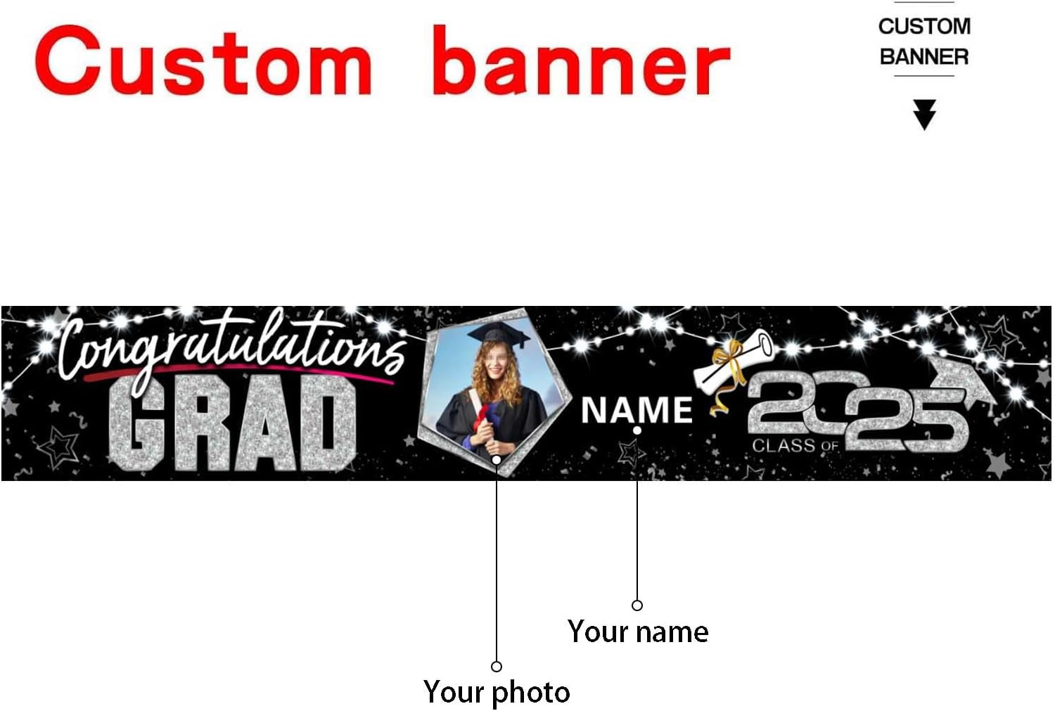 - 🎓Custom Decorations Banner: This is a Congratulations Graduation banner,That supports customization, You can customize name/photo/text on your banner to add atmosphere to your Graduation party.📏Suitable size: We have five sizes :1.6x9.8ft/2x12ft/2.5x16ft/3x17ft/3.3x20ft for your choice.Banner large enough to decorate your party and will be shown nicely in photos, instantly livening up your party setting.👍Reliable material: Personalized Graduation Decorations banner is made of durable polyester fabric, lightweight, washable and tear-resistant, and can last for a long time use; It can be folded for convenient storage, also easy to carry.Very impressive and make your party unforgettabl.🎁Easy to Use: This Decorations Banner comes with a 30 ft/ 11 m rope, easy to hang through the copper grommet (also included) at each corner, which can save your time and energy to decorate.🎉Wide Application: It’s great for hanging the Graduation banner in the outdoor or indoor, yard, wall, playground and more. It can be used as tablecloth, wallpaper, curtain, backdrop for photo studio. It will do bring the cheers to you, your friends and your family!