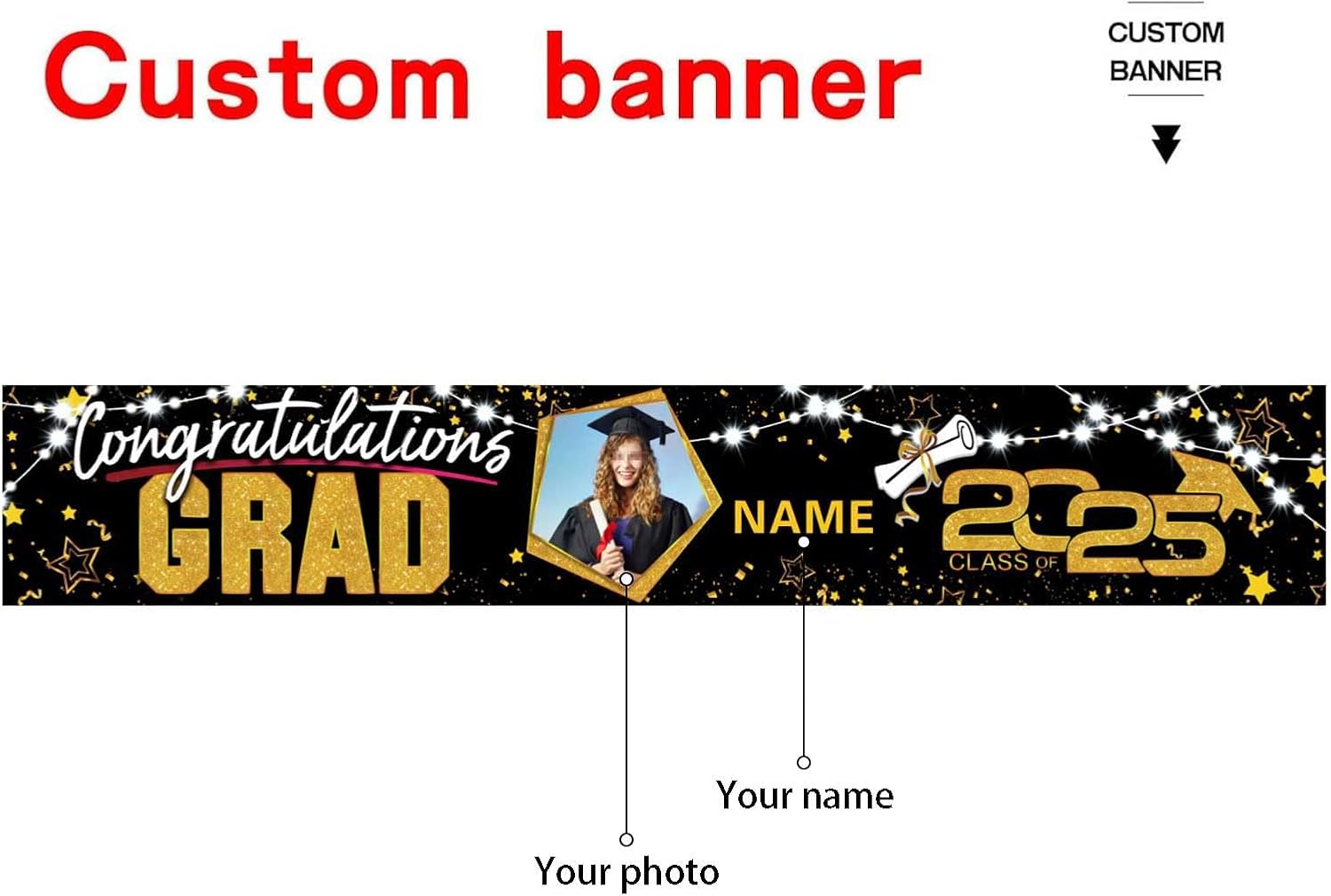 - 🎓Custom Decorations Banner: This is a Congratulations Graduation banner,That supports customization, You can customize name/photo/text on your banner to add atmosphere to your Graduation party.📏Suitable size: We have five sizes :1.6x9.8ft/2x12ft/2.5x16ft/3x17ft/3.3x20ft for your choice.Banner large enough to decorate your party and will be shown nicely in photos, instantly livening up your party setting.👍Reliable material: Personalized Graduation Decorations banner is made of durable polyester fabric, lightweight, washable and tear-resistant, and can last for a long time use; It can be folded for convenient storage, also easy to carry.Very impressive and make your party unforgettabl.🎁Easy to Use: This Decorations Banner comes with a 30 ft/ 11 m rope, easy to hang through the copper grommet (also included) at each corner, which can save your time and energy to decorate.🎉Wide Application: It’s great for hanging the Graduation banner in the outdoor or indoor, yard, wall, playground and more. It can be used as tablecloth, wallpaper, curtain, backdrop for photo studio. It will do bring the cheers to you, your friends and your family!