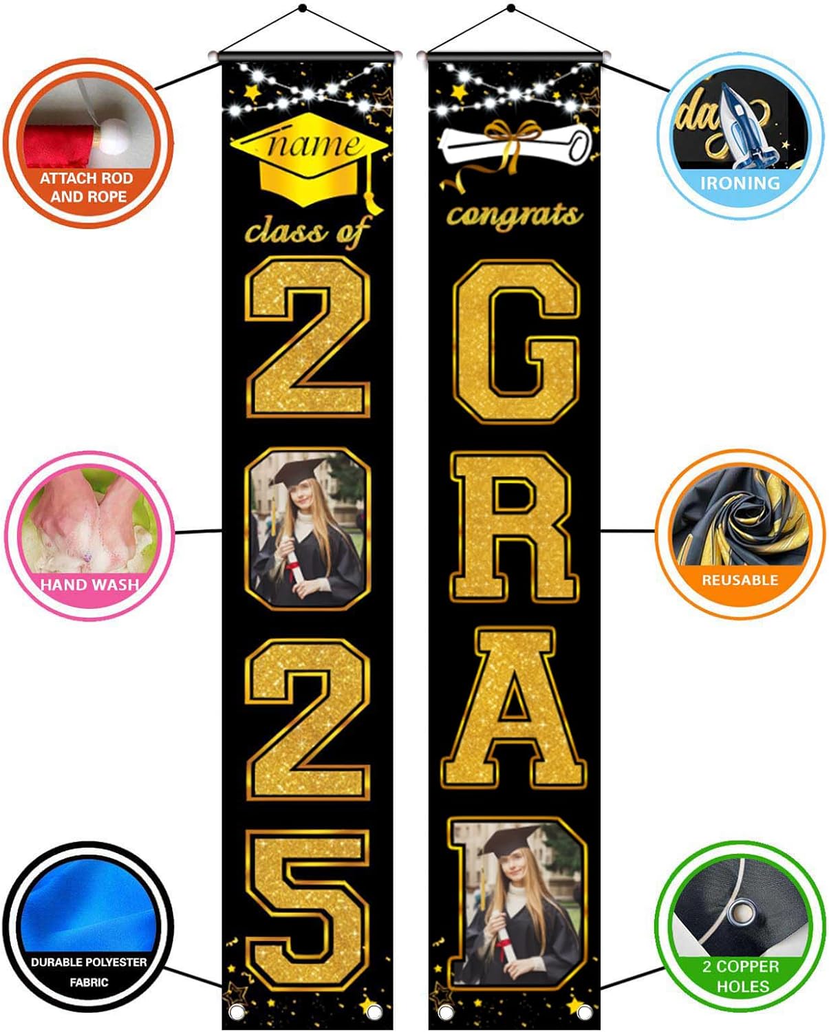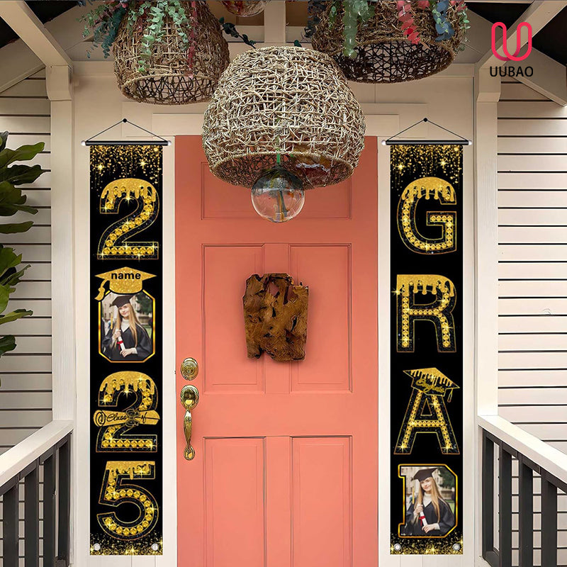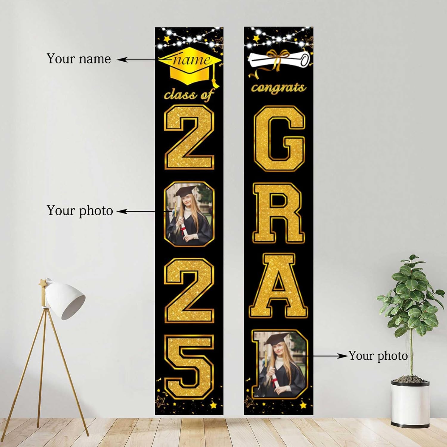 - 【Customize】Upload your favorite photos and preview the designs. Celebrate your graduation with our brand new 2025 Graduation door banner,add atmosphere to your graduation party.Featuring customizable size, photo and name for a truly personal touch.Just start from "customize now" on top button.【Material】Made of durable polyester fabric, lightweight, washable and tear-resistant, and can last for a long time use; It can be folded for convenient storage and carry.【Quick and easy to set up】13x70inches standard size,with pre-punched holes and a durable material, our graduation banners can be hung indoors or outdoors in minutes, ensuring hassle-free decoration.【Wide Application】The strong,clear pattern is very eye-catching.It’s great for hanging the Graduation banner in the outdoor or indoor.It also can be used as wallpaper, curtain, backdrop for photo studio. It will do bring the cheers to you, your friends and your family!【Service】We provide Risk Free 30-Day Money Back Guarantee.Please buy with confidence.Any problem or other special customization requirements, please contact us from message,we will give you solution within 24 hours.