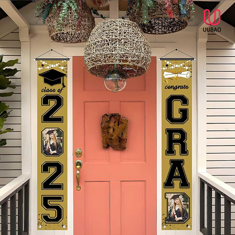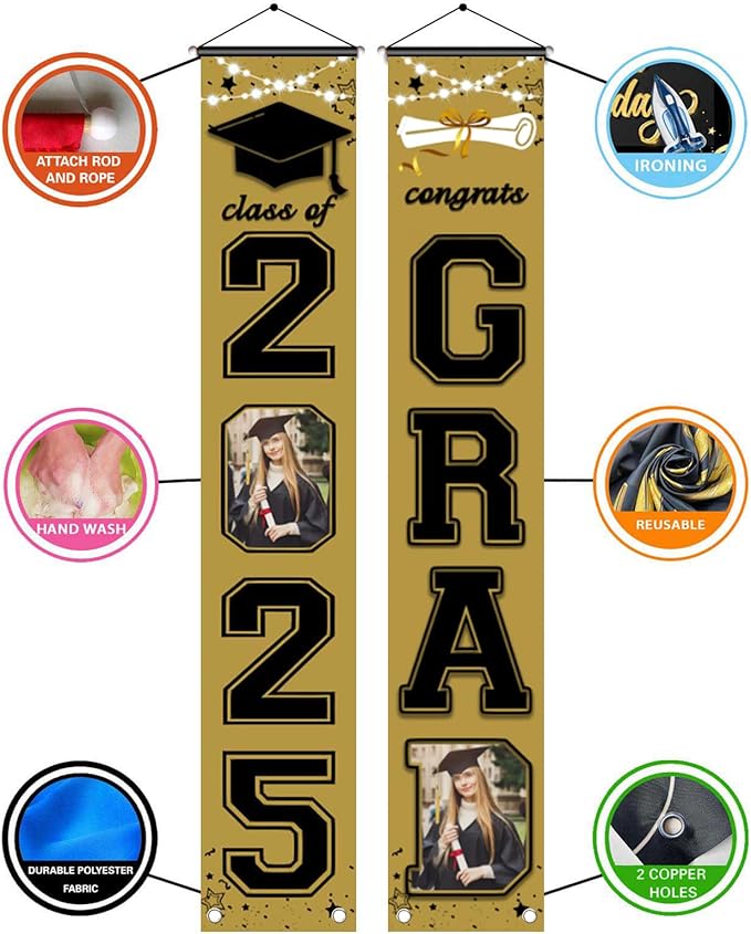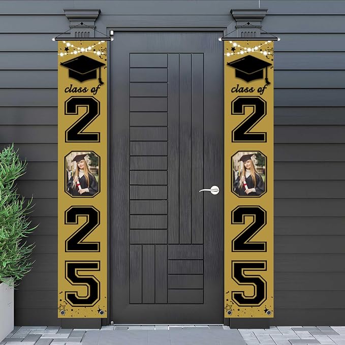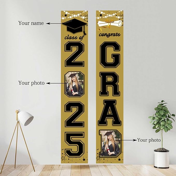 - 【Customize】Upload your favorite photos and preview the designs. Celebrate your graduation with our brand new 2025 Graduation door banner,add atmosphere to your graduation party.Featuring customizable size, photo and name for a truly personal touch.Just start from "customize now" on top button.【Material】Made of durable polyester fabric, lightweight, washable and tear-resistant, and can last for a long time use; It can be folded for convenient storage and carry.【Quick and easy to set up】13x70inches standard size,with pre-punched holes and a durable material, our graduation banners can be hung indoors or outdoors in minutes, ensuring hassle-free decoration.【Wide Application】The strong,clear pattern is very eye-catching.It’s great for hanging the Graduation banner in the outdoor or indoor.It also can be used as wallpaper, curtain, backdrop for photo studio. It will do bring the cheers to you, your friends and your family!【Service】We provide Risk Free 30-Day Money Back Guarantee.Please buy with confidence.Any problem or other special customization requirements, please contact us from message,we will give you solution within 24 hours.