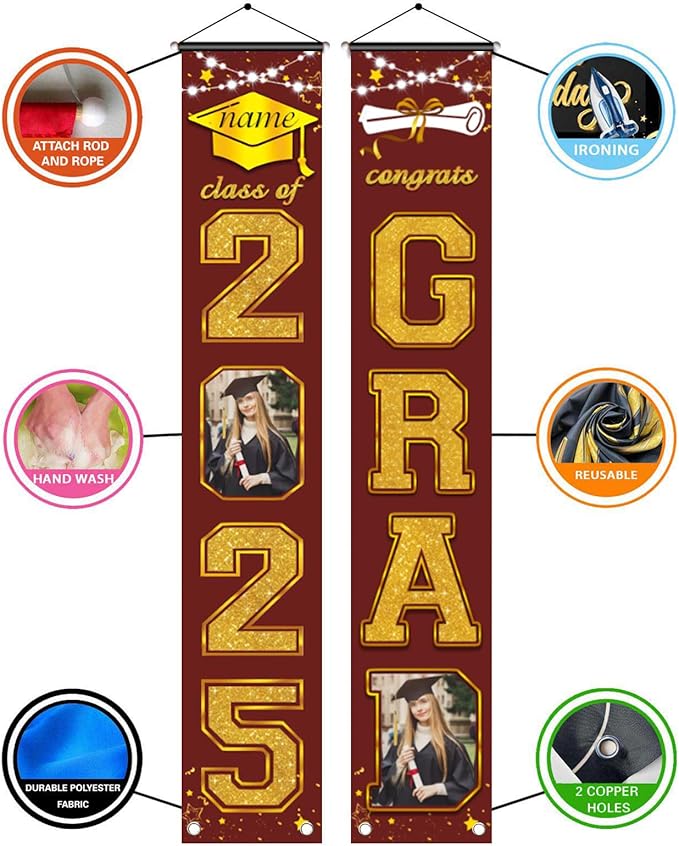 - 【Customize】Upload your favorite photos and preview the designs. Celebrate your graduation with our brand new 2025 Graduation door banner,add atmosphere to your graduation party.Featuring customizable size, photo and name for a truly personal touch.Just start from "customize now" on top button.【Material】Made of durable polyester fabric, lightweight, washable and tear-resistant, and can last for a long time use; It can be folded for convenient storage and carry.【Quick and easy to set up】13x70inches standard size,with pre-punched holes and a durable material, our graduation banners can be hung indoors or outdoors in minutes, ensuring hassle-free decoration.【Wide Application】The strong,clear pattern is very eye-catching.It’s great for hanging the Graduation banner in the outdoor or indoor.It also can be used as wallpaper, curtain, backdrop for photo studio. It will do bring the cheers to you, your friends and your family!【Service】We provide Risk Free 30-Day Money Back Guarantee.Please buy with confidence.Any problem or other special customization requirements, please contact us from message,we will give you solution within 24 hours.