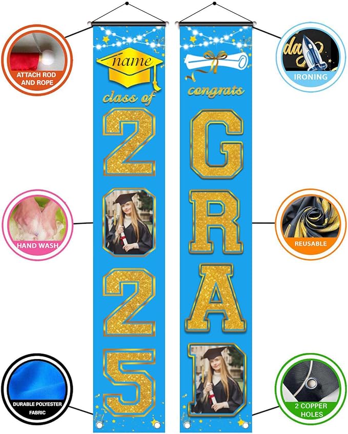 - 【Customize】Upload your favorite photos and preview the designs. Celebrate your graduation with our brand new 2025 Graduation door banner,add atmosphere to your graduation party.Featuring customizable size, photo and name for a truly personal touch.Just start from "customize now" on top button.【Material】Made of durable polyester fabric, lightweight, washable and tear-resistant, and can last for a long time use; It can be folded for convenient storage and carry.【Quick and easy to set up】13x70inches standard size,with pre-punched holes and a durable material, our graduation banners can be hung indoors or outdoors in minutes, ensuring hassle-free decoration.【Wide Application】The strong,clear pattern is very eye-catching.It’s great for hanging the Graduation banner in the outdoor or indoor.It also can be used as wallpaper, curtain, backdrop for photo studio. It will do bring the cheers to you, your friends and your family!【Service】We provide Risk Free 30-Day Money Back Guarantee.Please buy with confidence.Any problem or other special customization requirements, please contact us from message,we will give you solution within 24 hours.