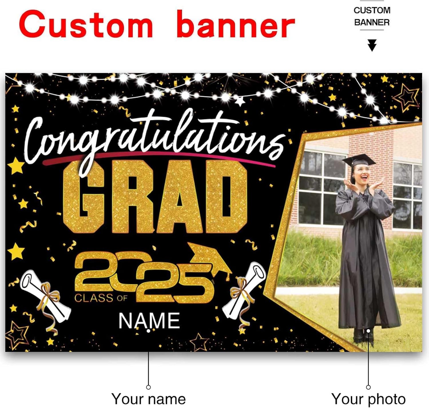 - 🎓Personalized customization: Celebrate the class of 2025 with a custom and personalized graduation banner, featuring a stunning black and gold color scheme, Easily customizable with photos and names, making it a thoughtful and unique graduation gift for the special graduate.📏Various Size: We have five sizes: 4x6ft/4.5x7ft/5x7.5ft/6x9ft/7x10.5ft for your choice, available to suit your party needs, ensuring the perfect photo background and backdrop for the occasion.👍High quality materials: Made from high-quality fabric, this graduation banner is durable and reusable, making it a sustainable party decoration choice.🎁Comes with accessories: Comes with a 30ft rope for easy hanging, adding convenience to your party preparations.