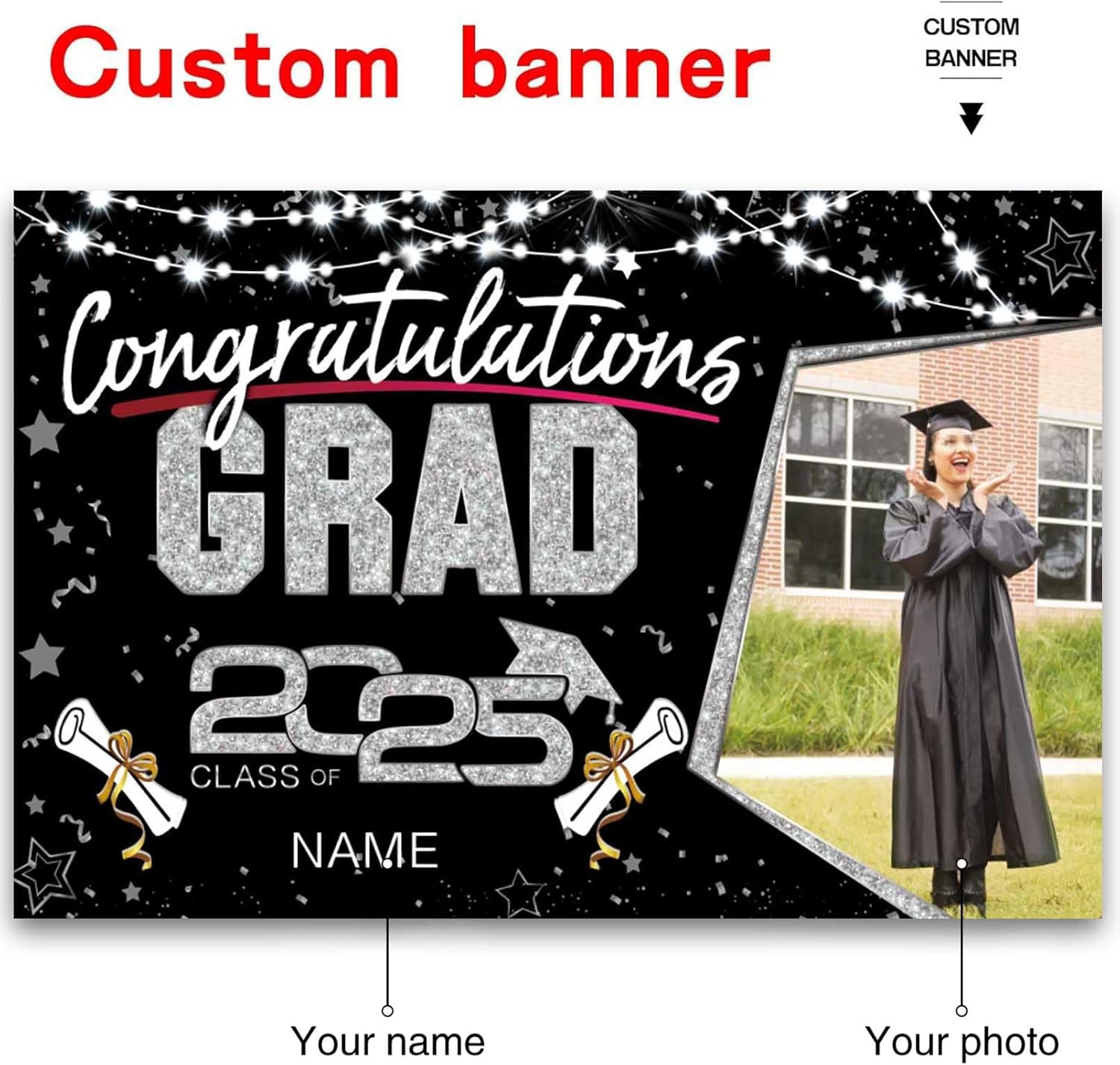 - 🎓Personalized customization: Celebrate the class of 2025 with a custom and personalized graduation banner, featuring a stunning black and silver color scheme, Easily customizable with photos and names, making it a thoughtful and unique graduation gift for the special graduate.📏Various Size: We have five sizes: 4x6ft/4.5x7ft/5x7.5ft/6x9ft/7x10.5ft for your choice, available to suit your party needs, ensuring the perfect photo background and backdrop for the occasion.👍High quality materials: Made from high-quality fabric, this graduation banner is durable and reusable, making it a sustainable party decoration choice.🎁Comes with accessories: Comes with a 30ft rope for easy hanging, adding convenience to your party preparations.