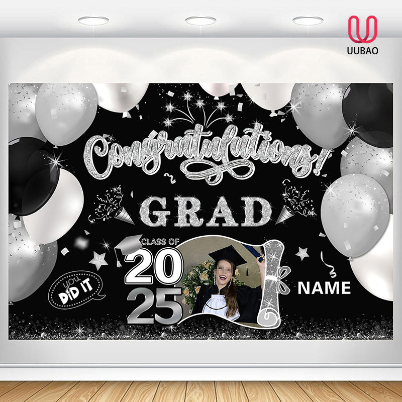 UUBAO Custom Graduation Party Decorations Personalization Banner Class of 2025 Backdrop (Black and Silver)
