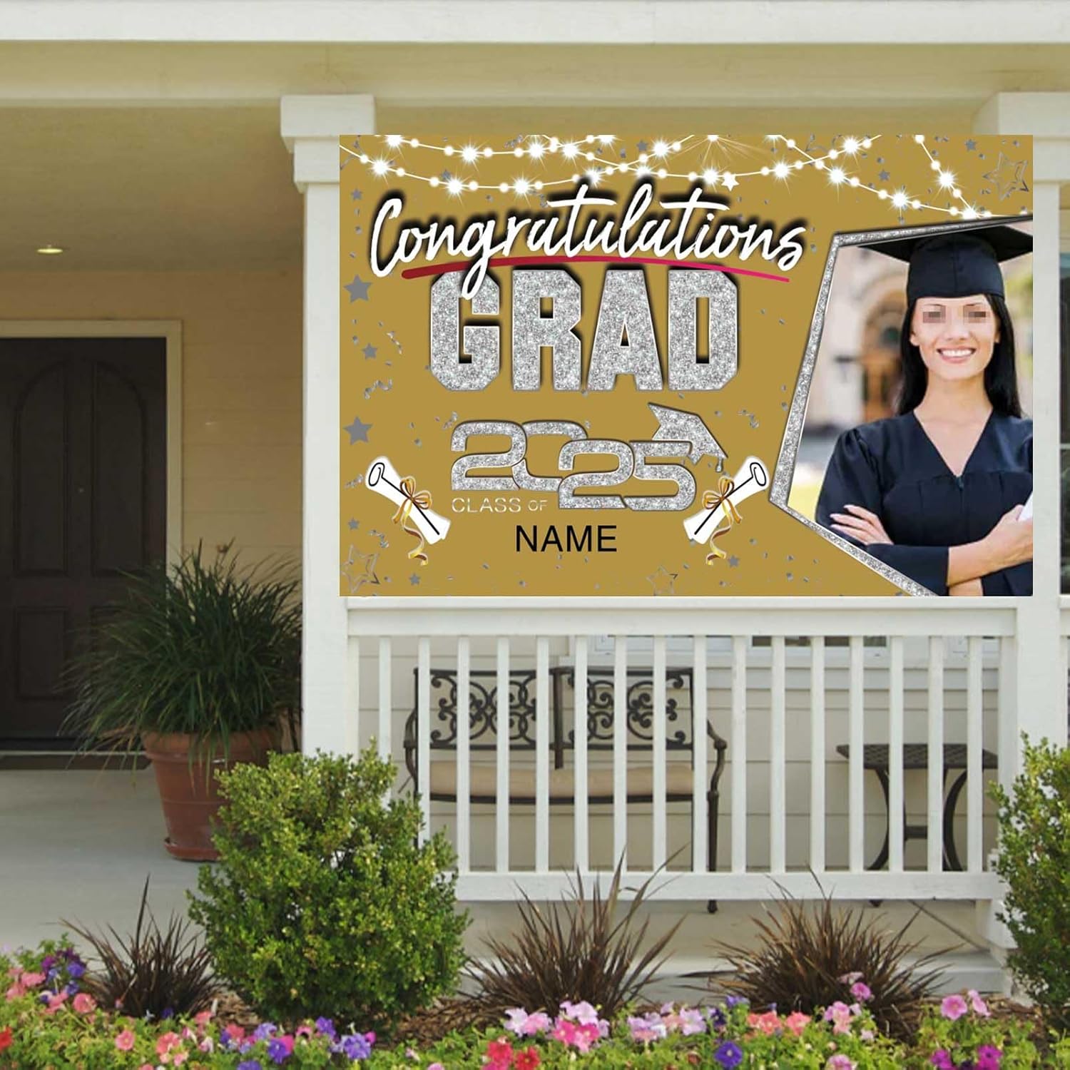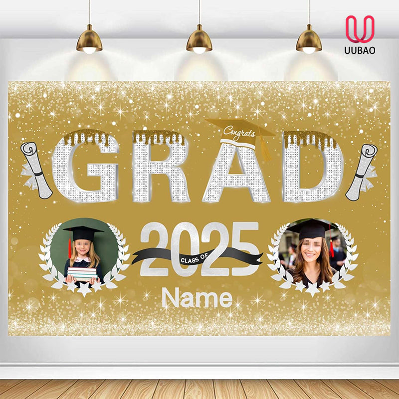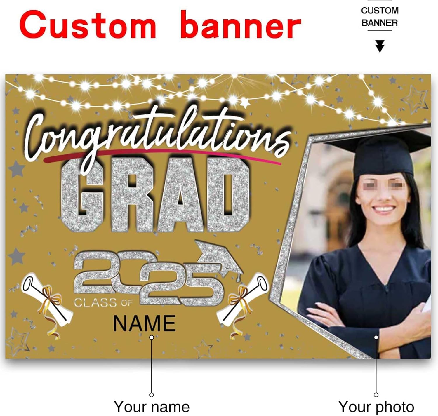 - 🎓Personalized customization: Celebrate the class of 2025 with a custom and personalized graduation banner, featuring a stunning champagne and silver color scheme, Easily customizable with photos and names, making it a thoughtful and unique graduation gift for the special graduate.📏Various Size: We have five sizes: 4x6ft/4.5x7ft/5x7.5ft/6x9ft/7x10.5ft for your choice, available to suit your party needs, ensuring the perfect photo background and backdrop for the occasion.👍High quality materials: Made from high-quality fabric, this graduation banner is durable and reusable, making it a sustainable party decoration choice.🎁Comes with accessories: Comes with a 30ft rope for easy hanging, adding convenience to your party preparations.