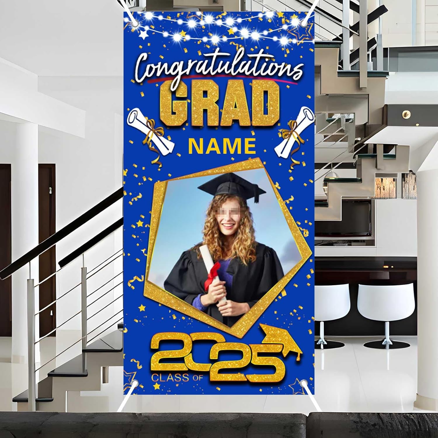 - 【Customize】Upload your favorite photos and preview the designs. Celebrate your graduation with our brand new 2025 Graduation door banner,add atmosphere to your graduation party.Featuring customizable size, photo and name for a truly personal touch.Just start from "customize now" on top button.【Material】Made of durable polyester fabric, lightweight, washable and tear-resistant, and can last for a long time use; It can be folded for convenient storage and carry.【Quick and easy to set up】35.4x70.8inches standard size,with pre-punched holes and a durable material, our graduation banners can be hung indoors or outdoors in minutes, ensuring hassle-free decoration.【Wide Application】The strong,clear pattern is very eye-catching.It’s great for hanging the Graduation banner in the outdoor or indoor.It also can be used as wallpaper, curtain, backdrop for photo studio. It will do bring the cheers to you, your friends and your family!【Service】We provide Risk Free 30-Day Money Back Guarantee.Please buy with confidence.Any problem or other special customization requirements, please contact us from message,we will give you solution within 24 hours.