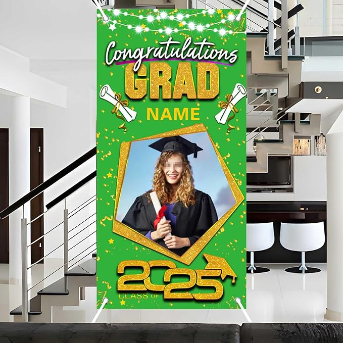 - 【Customize】Upload your favorite photos and preview the designs. Celebrate your graduation with our brand new 2025 Graduation door banner,add atmosphere to your graduation party.Featuring customizable size, photo and name for a truly personal touch.Just start from "customize now" on top button.【Material】Made of durable polyester fabric, lightweight, washable and tear-resistant, and can last for a long time use; It can be folded for convenient storage and carry.【Quick and easy to set up】35.4x70.8inches standard size,with pre-punched holes and a durable material, our graduation banners can be hung indoors or outdoors in minutes, ensuring hassle-free decoration.【Wide Application】The strong,clear pattern is very eye-catching.It’s great for hanging the Graduation banner in the outdoor or indoor.It also can be used as wallpaper, curtain, backdrop for photo studio. It will do bring the cheers to you, your friends and your family!【Service】We provide Risk Free 30-Day Money Back Guarantee.Please buy with confidence.Any problem or other special customization requirements, please contact us from message,we will give you solution within 24 hours.