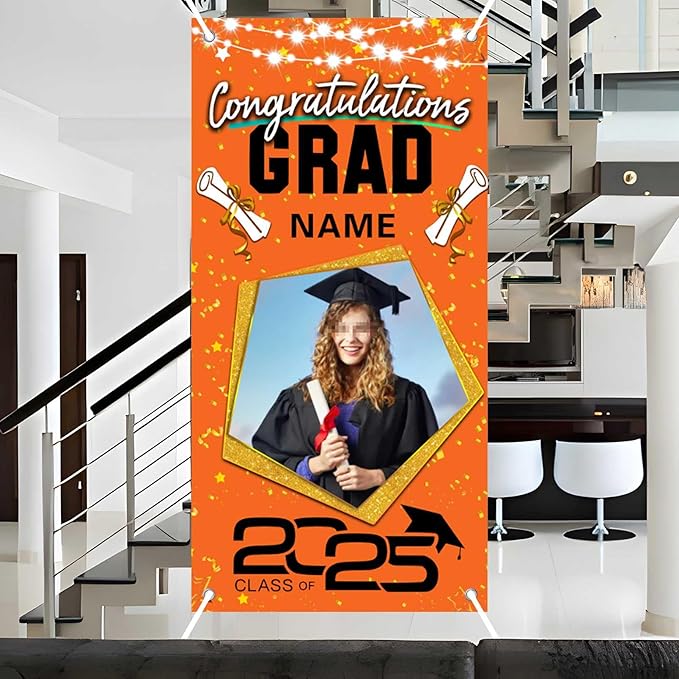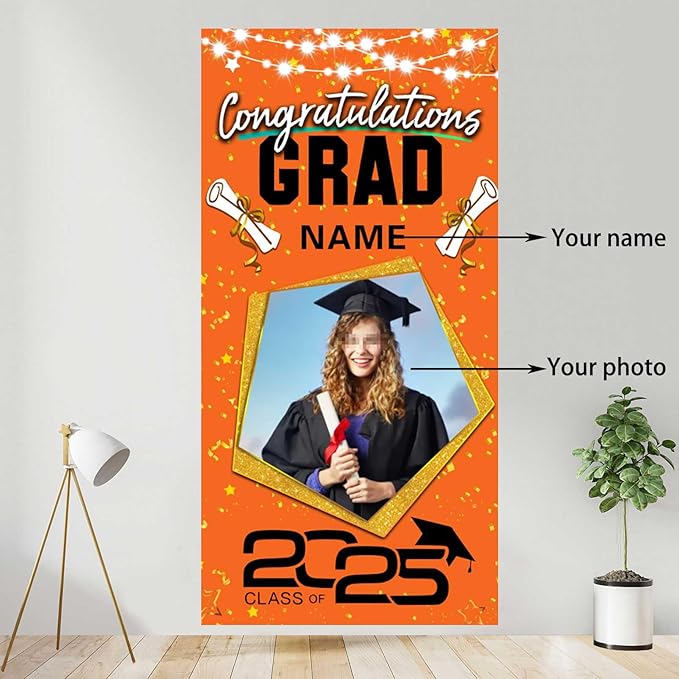 - 【Customize】Upload your favorite photos and preview the designs. Celebrate your graduation with our brand new 2025 Graduation door banner,add atmosphere to your graduation party.Featuring customizable size, photo and name for a truly personal touch.Just start from "customize now" on top button.【Material】Made of durable polyester fabric, lightweight, washable and tear-resistant, and can last for a long time use; It can be folded for convenient storage and carry.【Quick and easy to set up】35.4x70.8inches standard size,with pre-punched holes and a durable material, our graduation banners can be hung indoors or outdoors in minutes, ensuring hassle-free decoration.【Wide Application】The strong,clear pattern is very eye-catching.It’s great for hanging the Graduation banner in the outdoor or indoor.It also can be used as wallpaper, curtain, backdrop for photo studio. It will do bring the cheers to you, your friends and your family!【Service】We provide Risk Free 30-Day Money Back Guarantee.Please buy with confidence.Any problem or other special customization requirements, please contact us from message,we will give you solution within 24 hours.