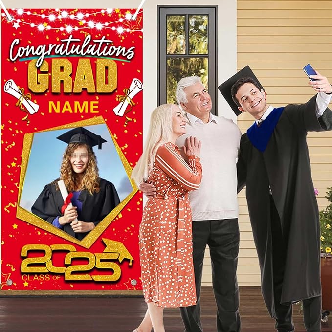 【Customize】Upload your favorite photos and preview the designs. Celebrate your graduation with our brand new 2025 Graduation door banner,add atmosphere to your graduation party.Featuring customizable size, photo and name for a truly personal touch.Just start from "customize now" on top button.
