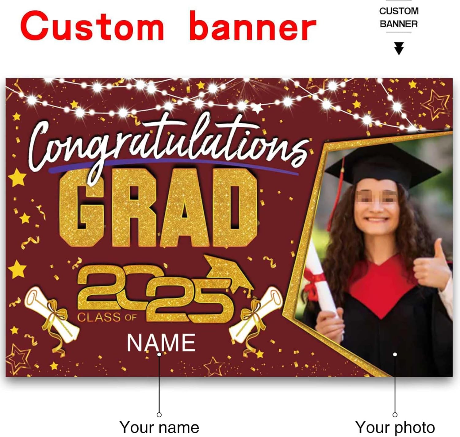 - 🎓Personalized customization: Celebrate the class of 2025 with a custom and personalized graduation banner, featuring a stunning maroon and gold color scheme, Easily customizable with photos and names, making it a thoughtful and unique graduation gift for the special graduate.📏Various Size: We have five sizes: 4x6ft/4.5x7ft/5x7.5ft/6x9ft/7x10.5ft for your choice, available to suit your party needs, ensuring the perfect photo background and backdrop for the occasion.👍High quality materials: Made from high-quality fabric, this graduation banner is durable and reusable, making it a sustainable party decoration choice.🎁Comes with accessories: Comes with a 30ft rope for easy hanging, adding convenience to your party preparations.