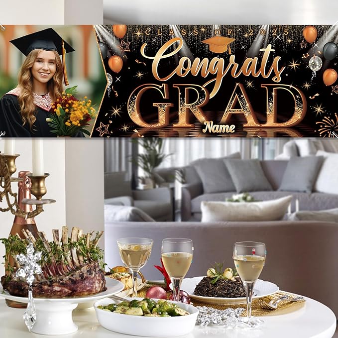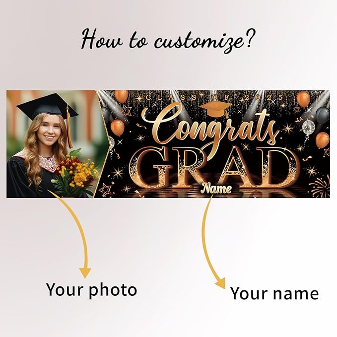 【Customize】Upload your favorite photos and preview the designs. Celebrate your graduation with our brand new 2025 Graduation door banner,add atmosphere to your graduation party.Featuring customizable size, photo and name for a truly personal touch.Just start from "customize now" on top button.