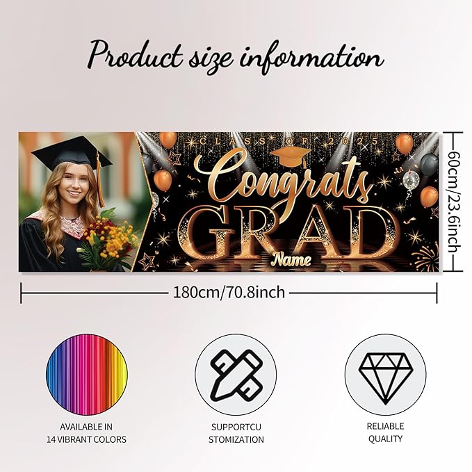 • 【Customize】Upload your favorite photos and preview the designs. Celebrate your graduation with our brand new 2025 Graduation door banner,add atmosphere to your graduation party.Featuring customizable size, photo and name for a truly personal touch.Just start from "customize now" on top button.