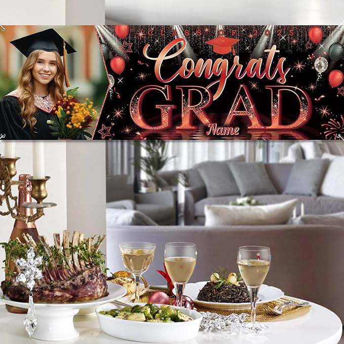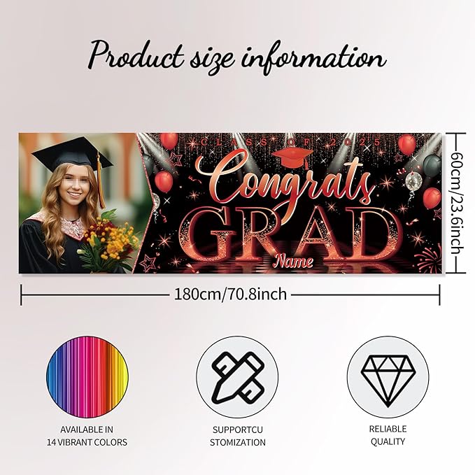 • 【Customize】Upload your favorite photos and preview the designs. Celebrate your graduation with our brand new 2025 Graduation door banner,add atmosphere to your graduation party.Featuring customizable size, photo and name for a truly personal touch.Just start from "customize now" on top button.