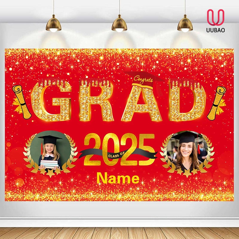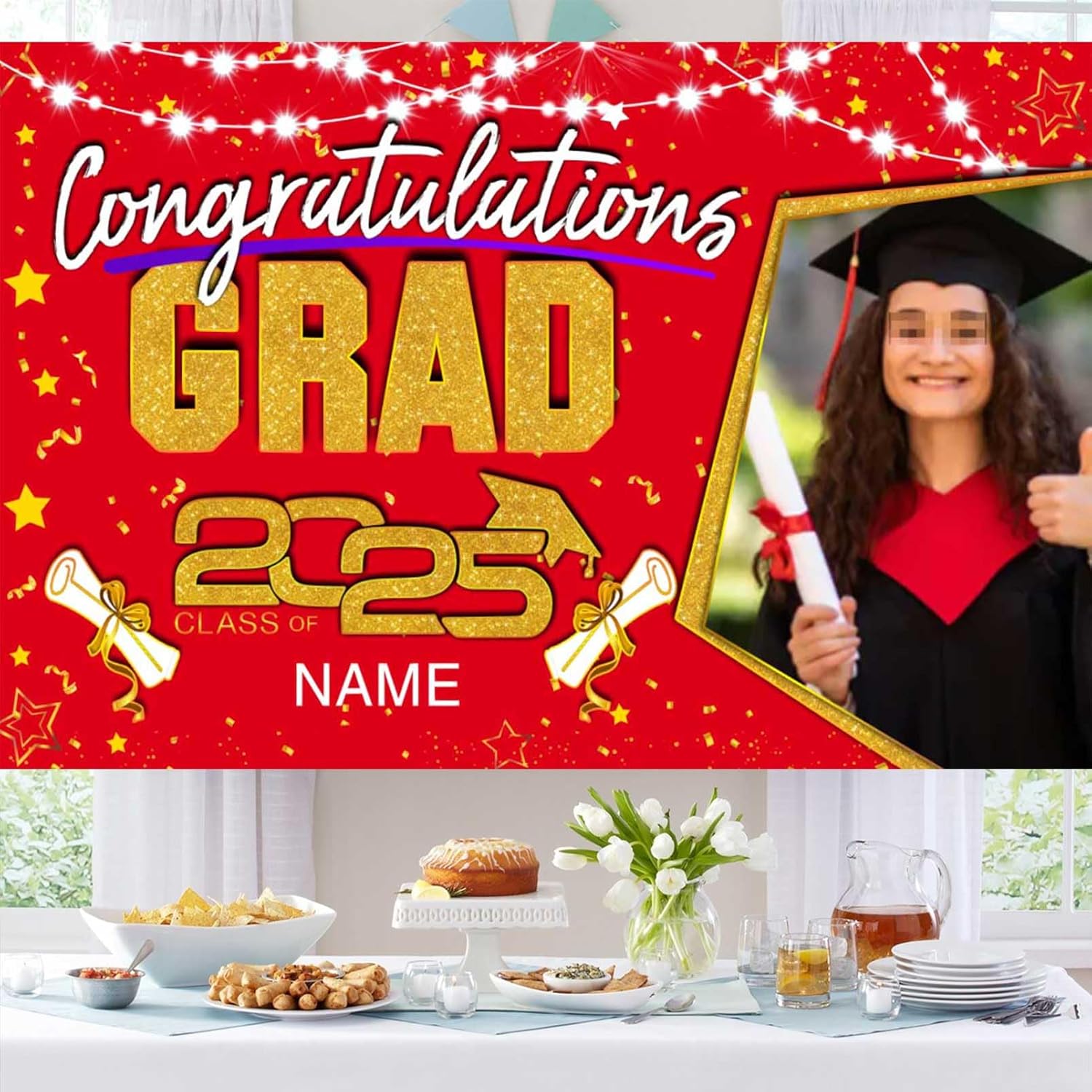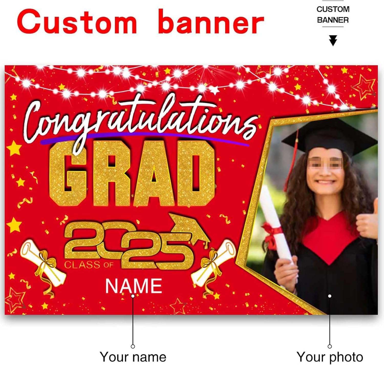 - 🎓Personalized customization: Celebrate the class of 2025 with a custom and personalized graduation banner, featuring a stunning red and gold color scheme, Easily customizable with photos and names, making it a thoughtful and unique graduation gift for the special graduate.📏Various Size: We have five sizes: 4x6ft/4.5x7ft/5x7.5ft/6x9ft/7x10.5ft for your choice, available to suit your party needs, ensuring the perfect photo background and backdrop for the occasion.👍High quality materials: Made from high-quality fabric, this graduation banner is durable and reusable, making it a sustainable party decoration choice.🎁Comes with accessories: Comes with a 30ft rope for easy hanging, adding convenience to your party preparations.