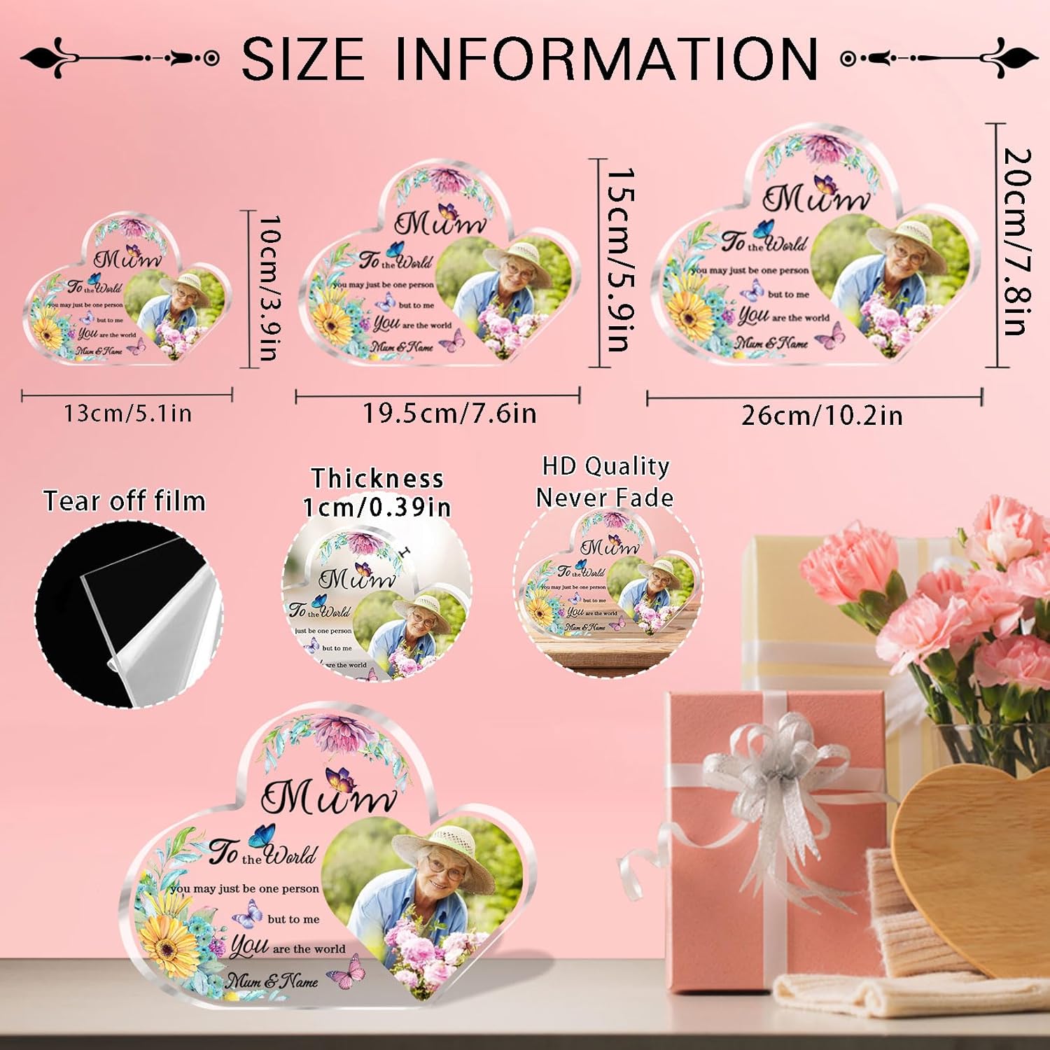 - 【Sturdy Material】This custom mom gift is made of durable and non-damaging acrylic. There are 3 sizes to choose from: 3.9x5.1/5.9x7.6/7.8x10.2 inches, and the thickness is 0.4 inches. Not easy to break or deformation, the use of high quality ink, printing is beautiful and vivid, never fade.