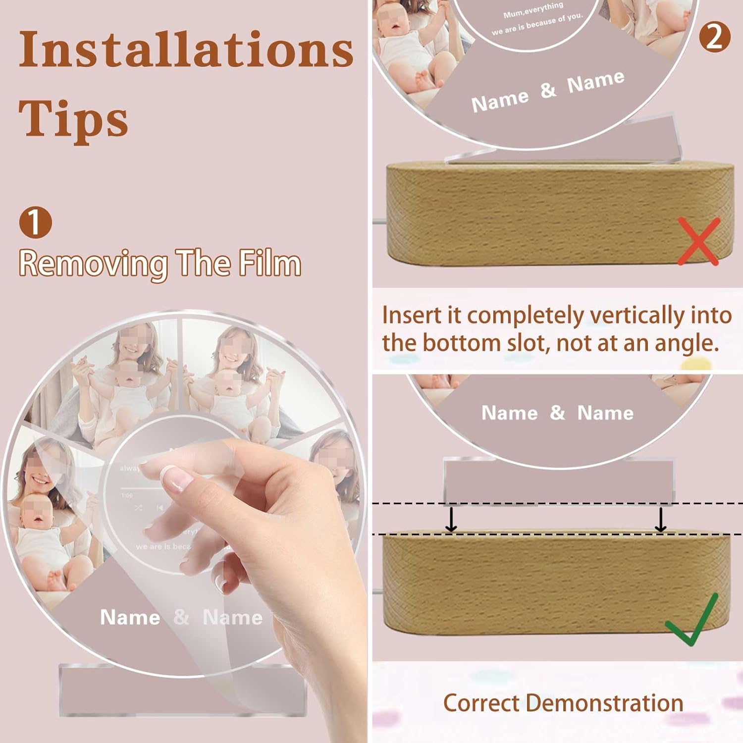 - 💖【Easy to Use】 Please remove the protective film before use. Then insert the acrylic plaque into the wooden base. The night light is USB charged with three different color temperatures, easy control on the cord to power on/off or switch to the lighting mode you prefer. Acrylic is easy to clean and maintain. Simply wipe it down with a soft cloth to remove dust or fingerprints.