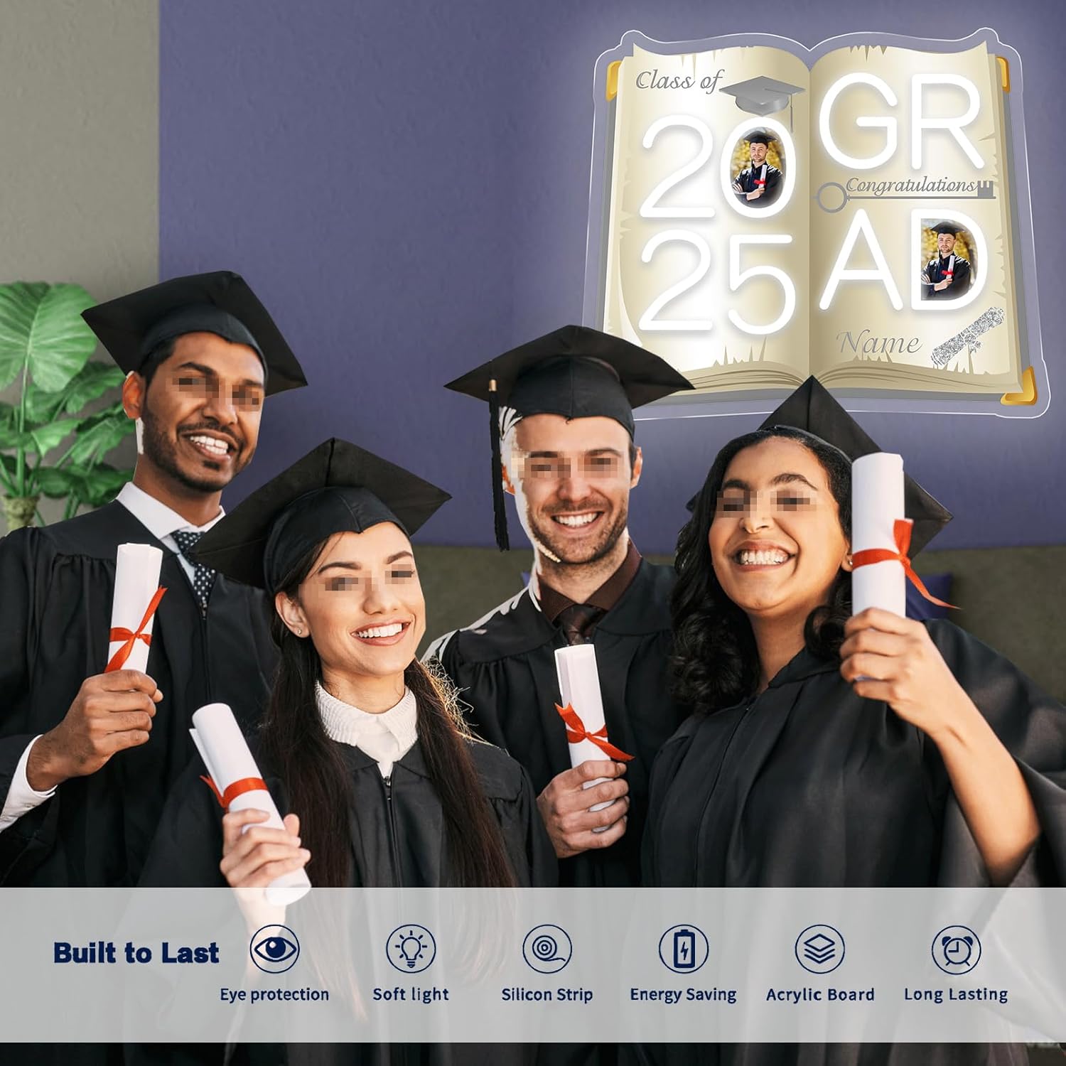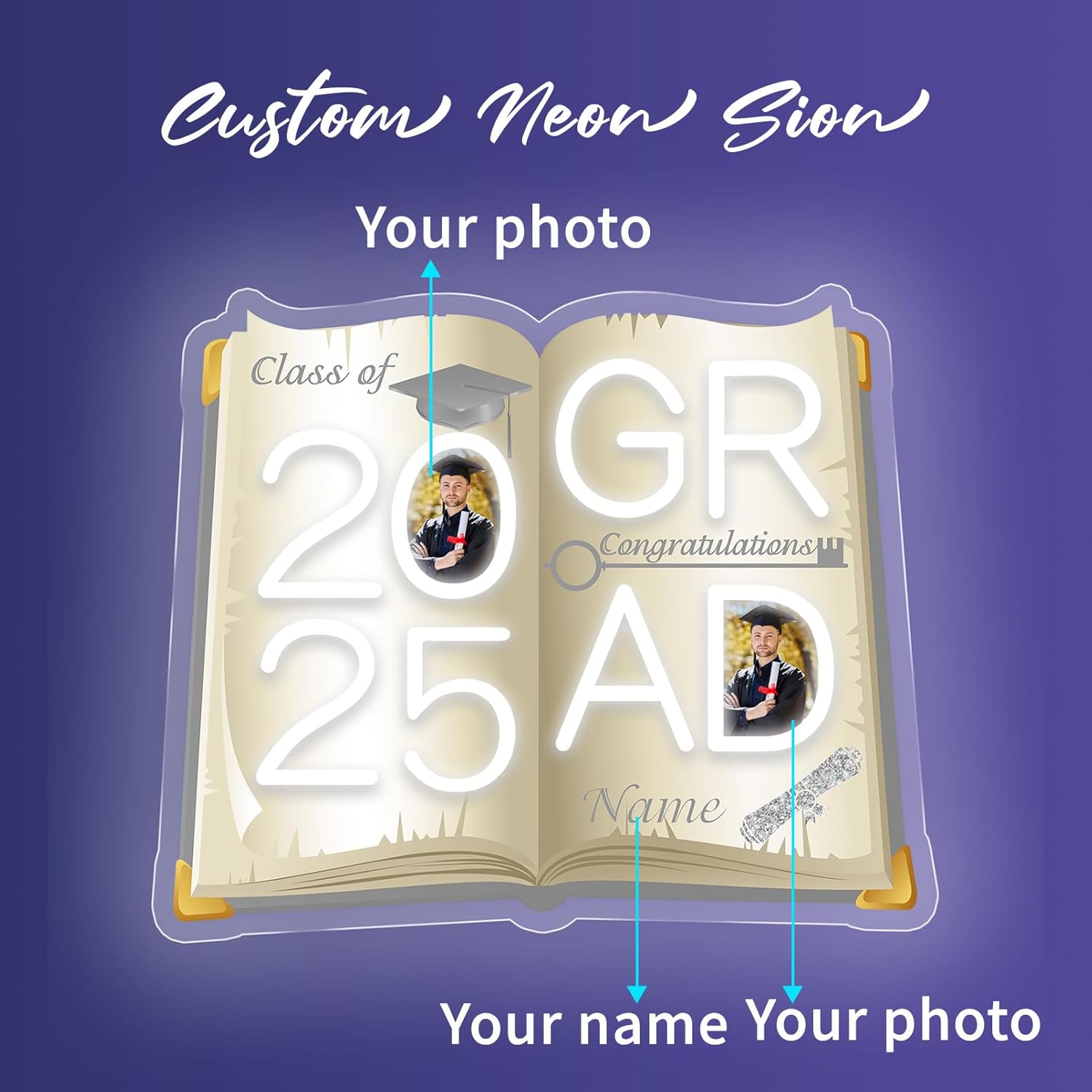 - 【Customize】Celebrate your graduation with our Custom 2025 Graduation neon sign,the unique style brighten up your space.featuring customizable size, photo and name for a truly personal touch.Just click "customize now" on top right. 【Material】Our LED neon sign is made of premium acrylic and silicone strip, safer and more bright but not dazzling.Professionally printed with bright patterns will never fade and lasts as a cherished memory for years to come.Energy-efficient LED lights make our neon signs both eco-friendly and cost-effective. 【Easy assembly and use】Comes with two different mounting accessories(metal chain,adhesive hooks) for easy hanging/mounting on a wall or other surface.Powered by USB,you can use any plug with USB port (no power adapter),The dimmer is on the usb cord, which is easy to adjust the brightness. 【Wide Application】Four sizes available: 10x12in/12x14.5in/15x18in/20x24in.The strong, clear pattern and crystal texture is very eye-catching in the sunlight. Ideal for display on a fireplace mantel, desk, closet, or locker, adding a touch of elegance to any space.Perfect choice for graduation gift and keepsake. 【 Service】We provide sincere service and products. Any problem or other special customization requirements, please contact us from message,we will give you solution within 24 hours.