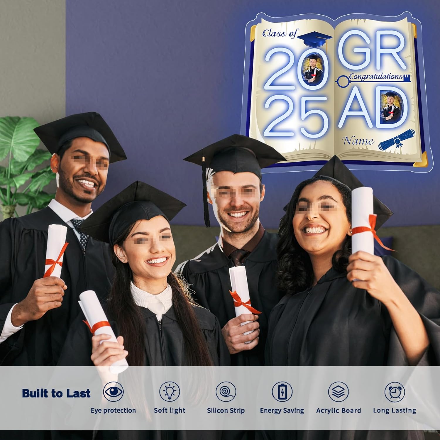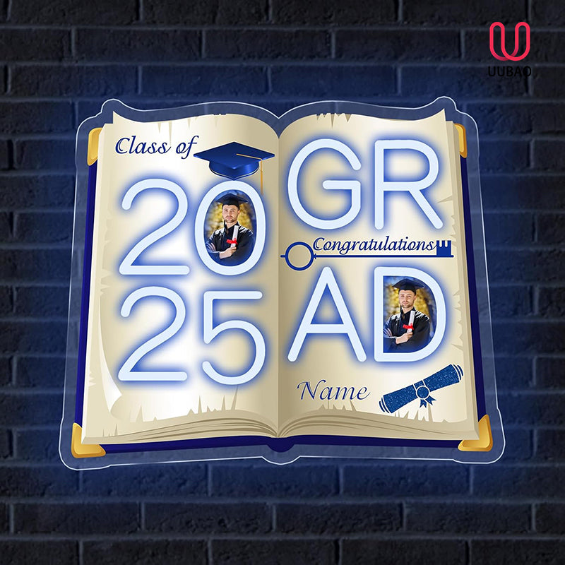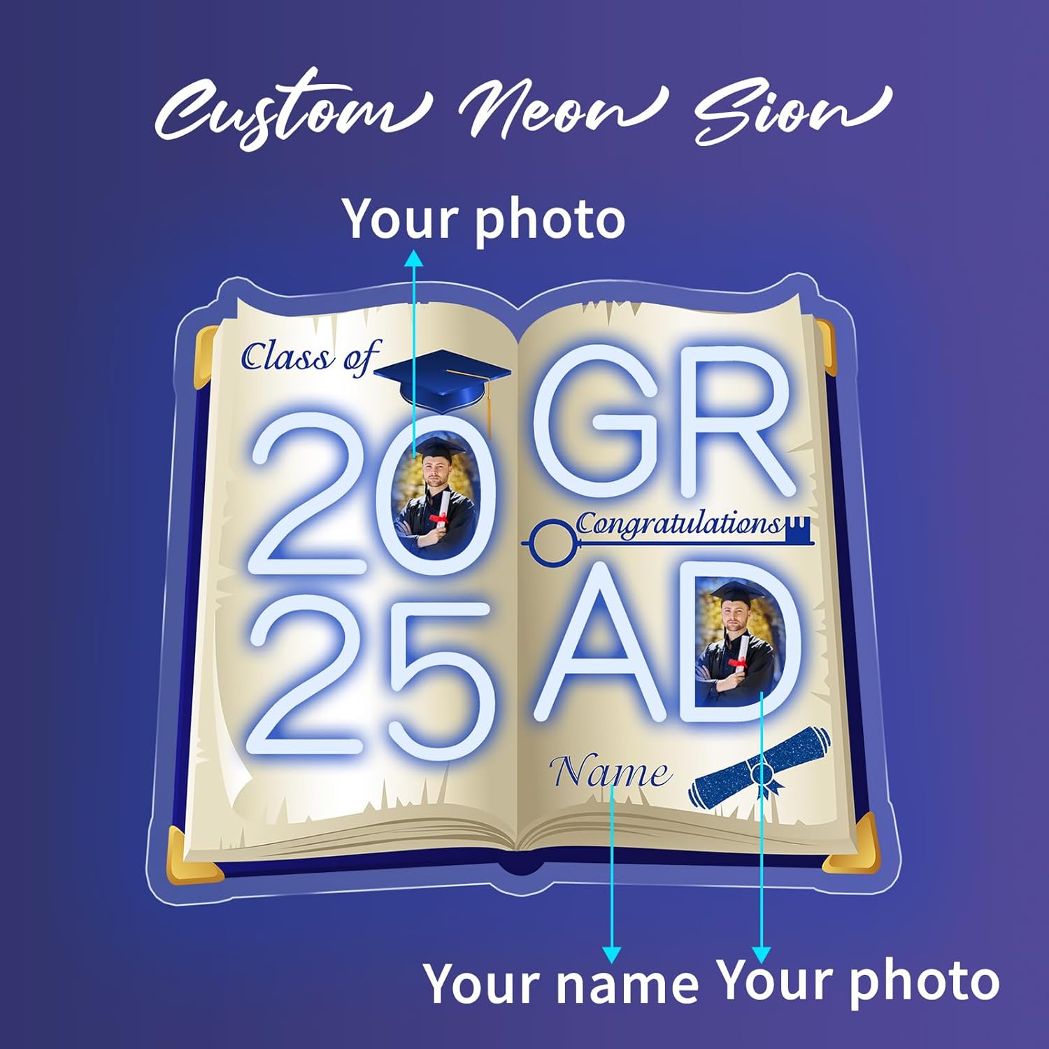 - 【Customize】Celebrate your graduation with our Custom 2025 Graduation neon sign,the unique style brighten up your space.featuring customizable size, photo and name for a truly personal touch.Just click "customize now" on top right. 【Material】Our LED neon sign is made of premium acrylic and silicone strip, safer and more bright but not dazzling.Professionally printed with bright patterns will never fade and lasts as a cherished memory for years to come.Energy-efficient LED lights make our neon signs both eco-friendly and cost-effective. 【Easy assembly and use】Comes with two different mounting accessories(metal chain,adhesive hooks) for easy hanging/mounting on a wall or other surface.Powered by USB,you can use any plug with USB port (no power adapter),The dimmer is on the usb cord, which is easy to adjust the brightness. 【Wide Application】Four sizes available: 10x12in/12x14.5in/15x18in/20x24in.The strong, clear pattern and crystal texture is very eye-catching in the sunlight. Ideal for display on a fireplace mantel, desk, closet, or locker, adding a touch of elegance to any space.Perfect choice for graduation gift and keepsake. 【 Service】We provide sincere service and products. Any problem or other special customization requirements, please contact us from message,we will give you solution within 24 hours.
