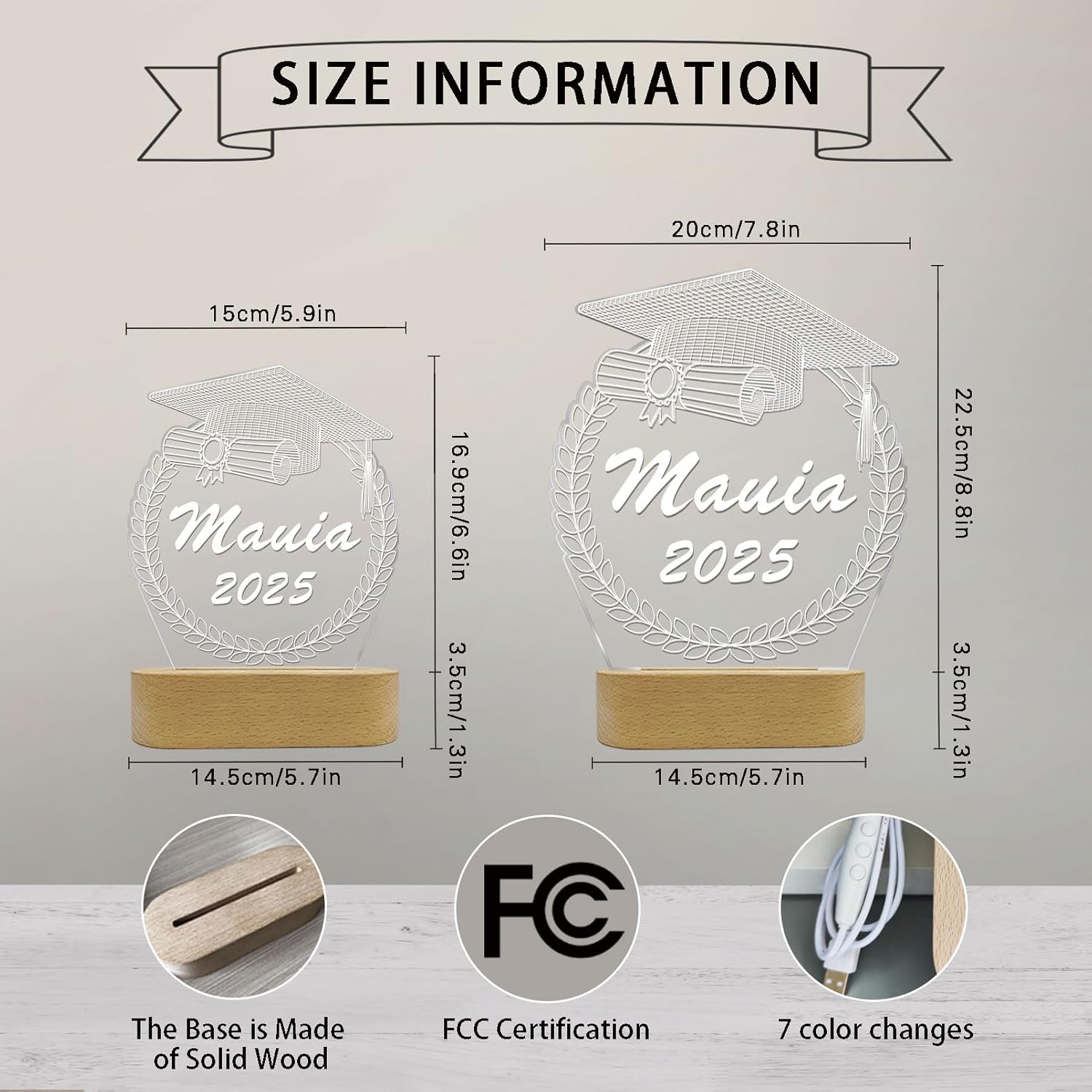 - 🎓【High Quality】This customized night light is made of high-quality transparent,acrylic, sturdy and durable, unbreakable,color never fade. Size:5.9x6.6/7.8x8.8in. The base of the night light is made of solid wood. In addition, it adopts laser engraving, the pattern is more bright and beautiful.