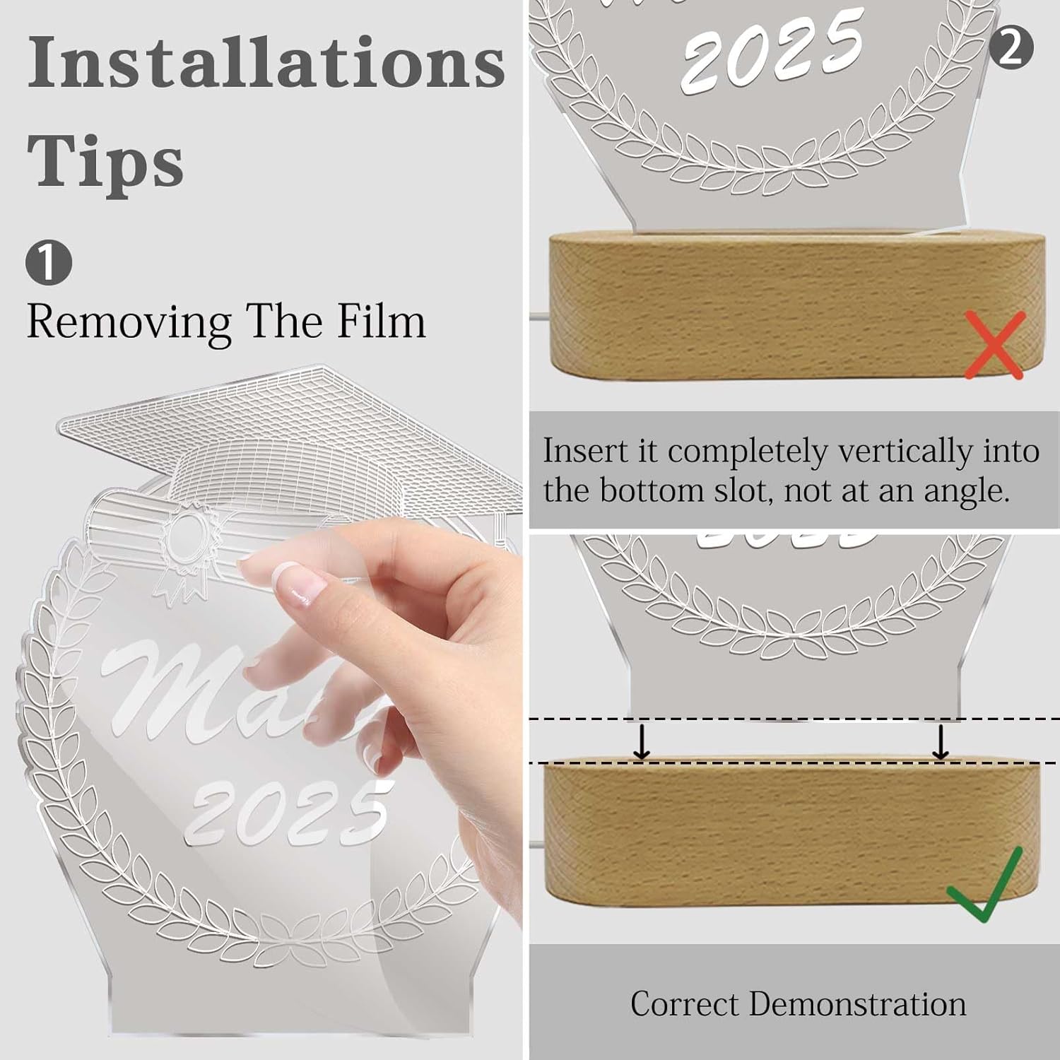 - 🎓【Easy to Use】 After receiving the night light, please remove the protective film.Insert the acrylic board into the base. Easy to maintain, just wipe with a damp cloth to clean fingerprints. The night light is USB charged. The button can be used to adjust 7 different color.