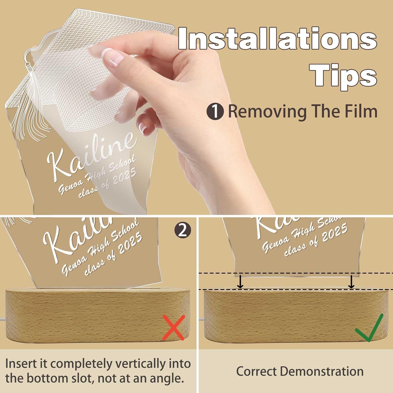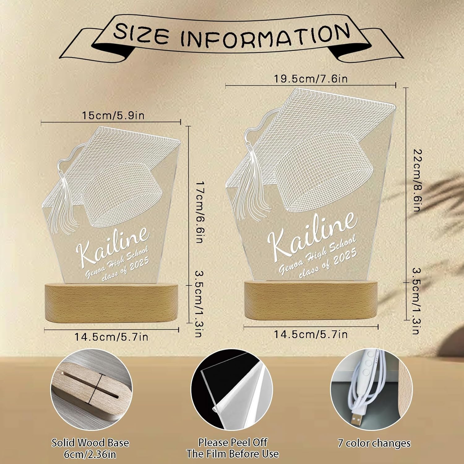 - 🎓【High Quality】This customized night light is made of high-quality transparent,acrylic, sturdy and durable, unbreakable,color never fade. Size:5.9x6.6/7.6x8.6in. The base of the night light is made of solid wood. In addition, it adopts laser engraving, the pattern is more bright and beautiful.