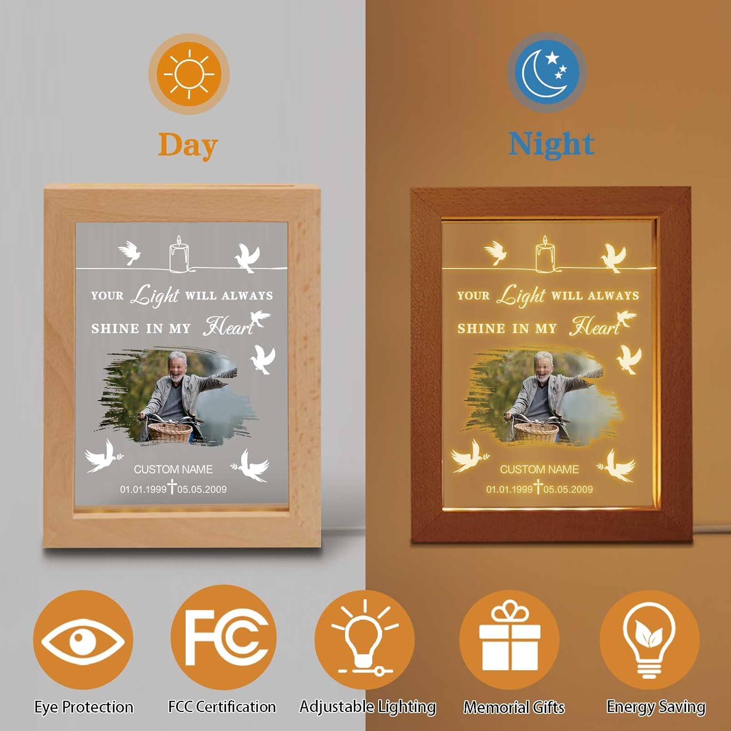 - 【Customize】This sympathy gifts can be customized with photo, name and date."Your light will always shine in my heart." It's really difficult to overcome the loss of a loved one. Words sometimes can be pale and nerveless for a grieving heart. By offering such gifts to bereaved people, you can help them keep cherished memories of their loved ones forever.