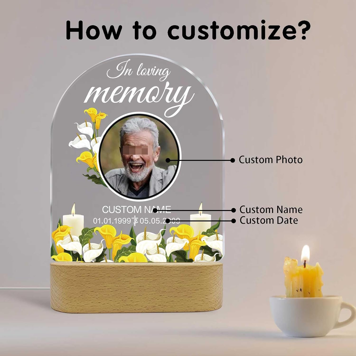- 【Customize】This sympathy gifts can be customized with photo, name and date."In loving memory." It's really difficult to overcome the loss of a loved one. Words sometimes can be pale and nerveless for a grieving heart. By offering such gifts to bereaved people, you can help them keep cherished memories of their loved ones forever.