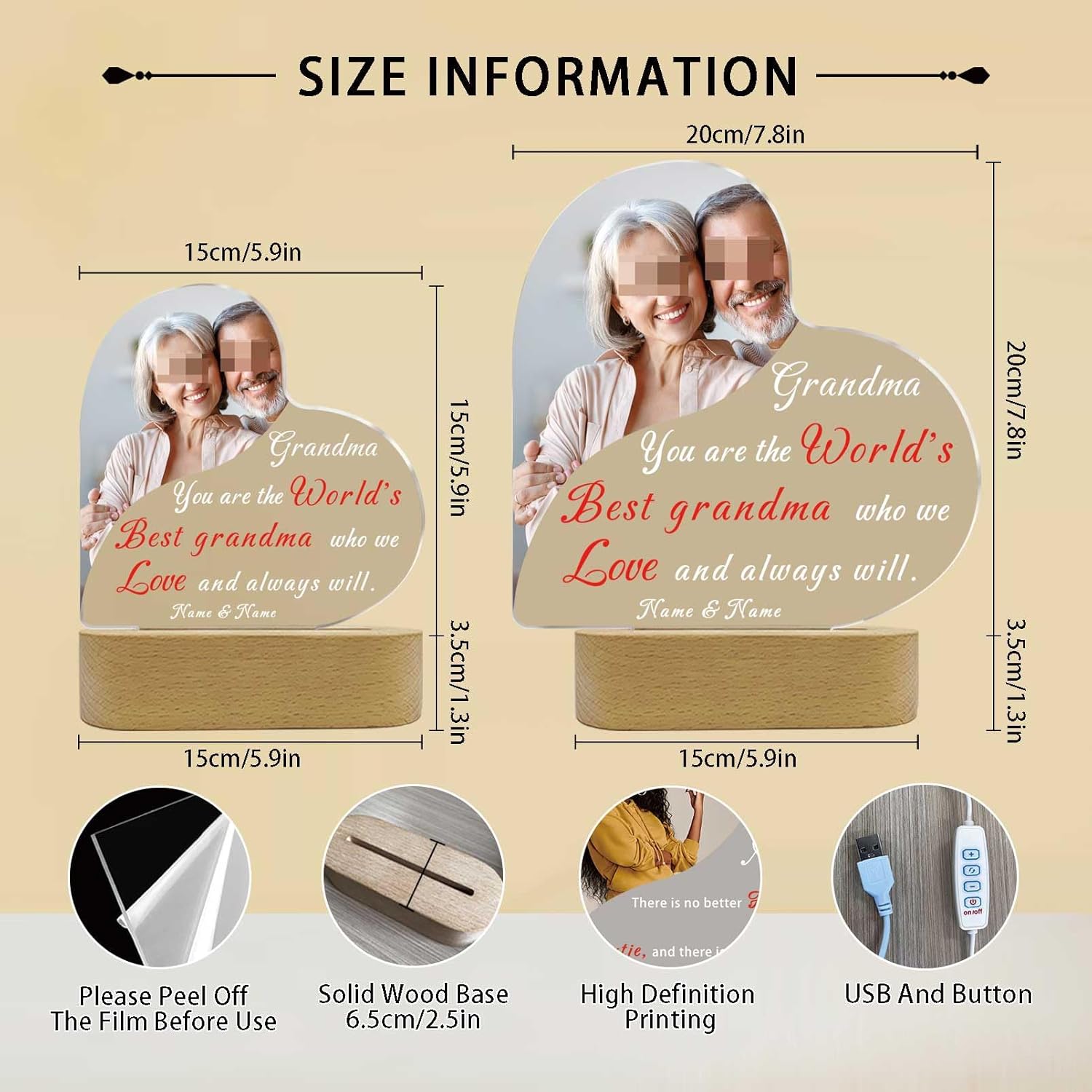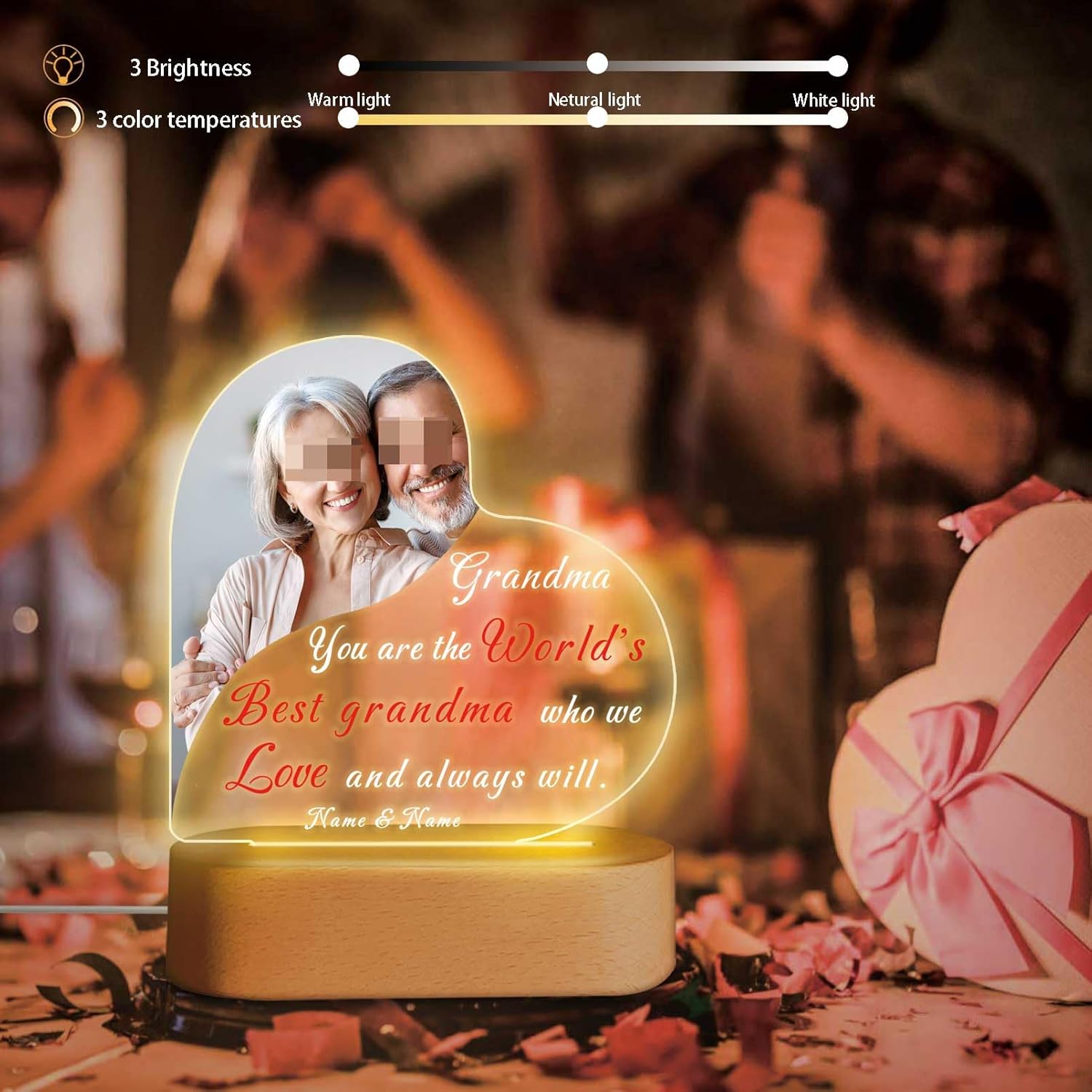UUBAO Personalized Mother's Day Night Light Gift with Wooden Base Custom Photo Acrylic Plaque LED Night Lamp Gift for Grandma