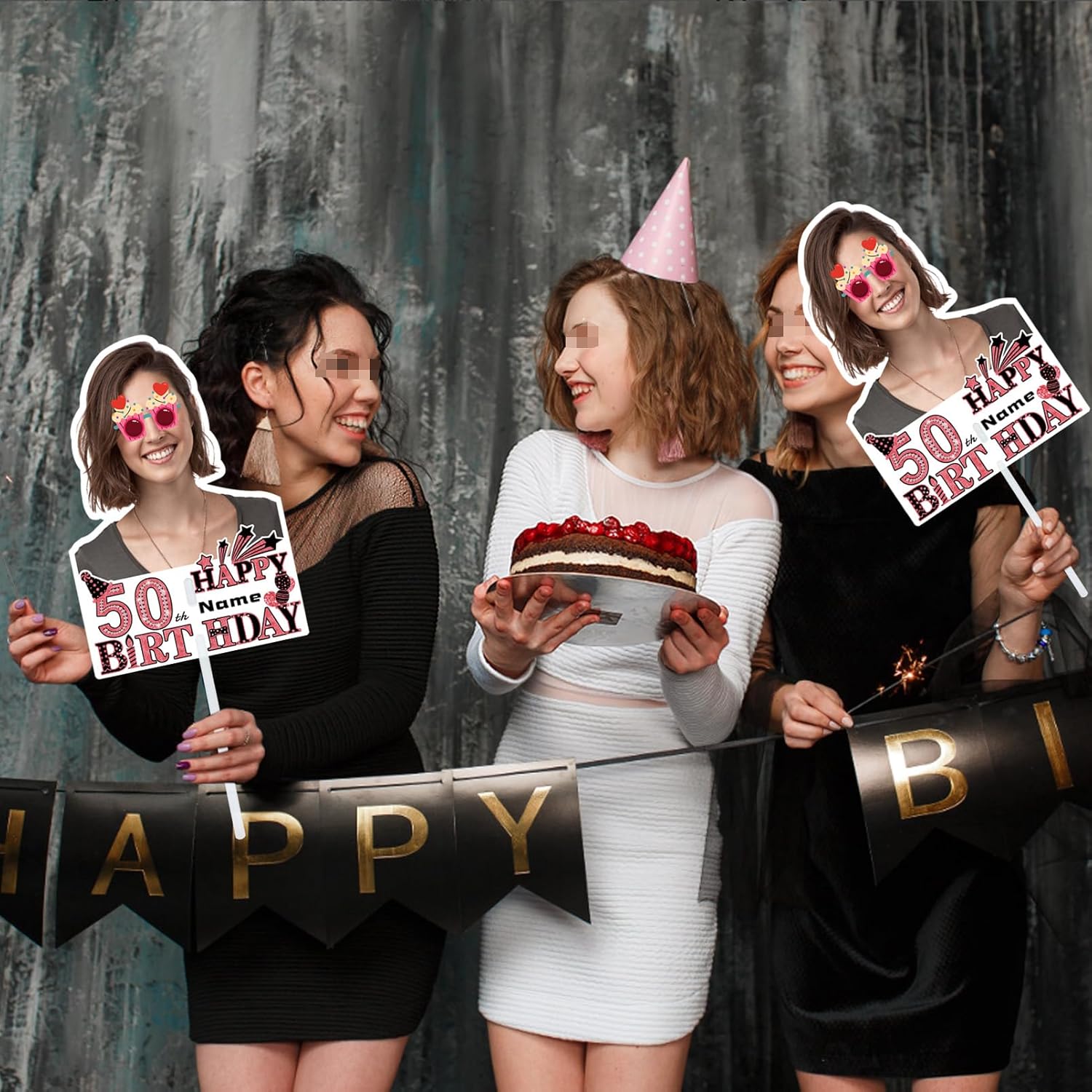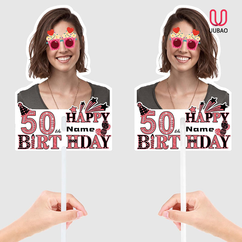 UUBAO Custom Happy Birthday Face Cutout Fans Personalized Photo Prop Signs for Birthday Party(Black and Rose Gold)