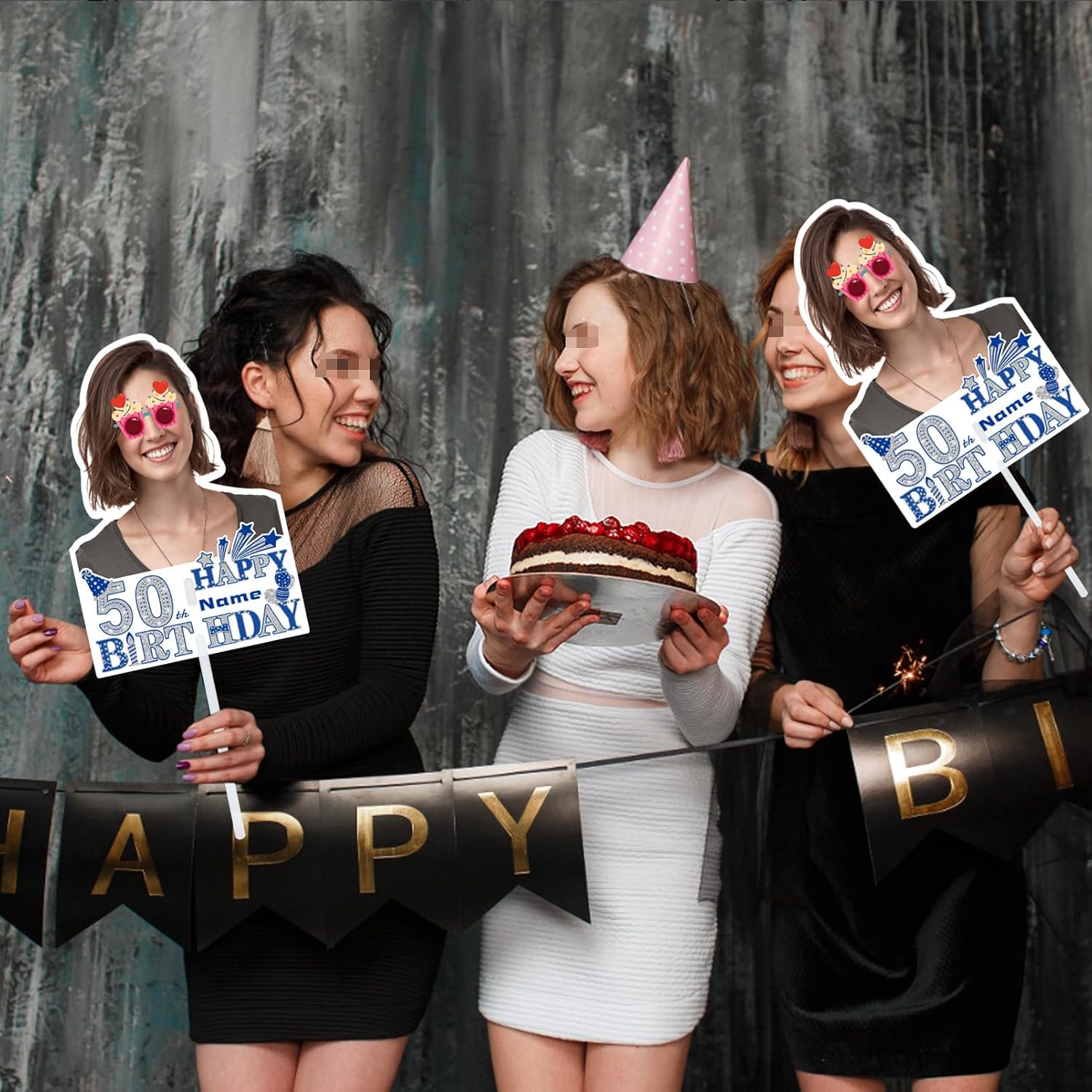 UUBAO Custom Happy Birthday Face Cutout Fans Personalized Photo Prop Signs for Birthday Party(Blue and Silver