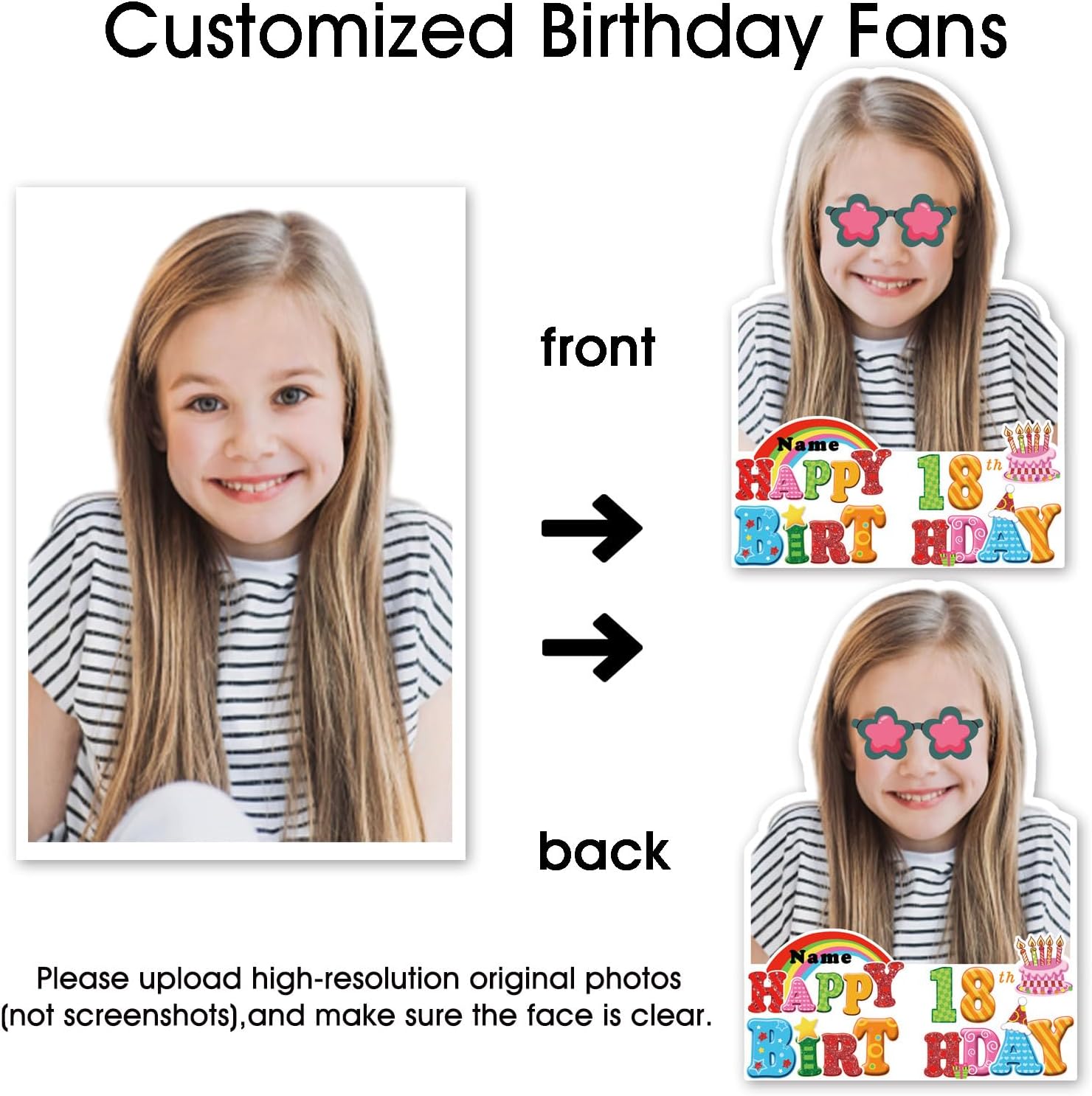 - 🎁【Customizable】Our birthday face fan supports photo and name customization, and the content you customize can be displayed on both sides! Quickly upload photos of the one you love and give them an exclusive surprise!